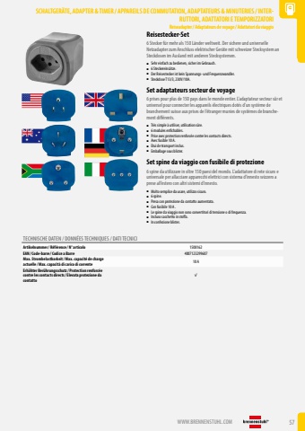WWW.BRENNENSTUHL.COM 57SCHALTGER%u00c4TE, ADAPTER & TIMER / APPAREILS DE COMMUTATION, ADAPTATEURS & MINUTERIES/INTERRUTTORI, ADATTATORI E TEMPORIZZATORIReiseadapter/ Adaptateurs de voyage/ Adattatori da viaggioSCHALTGER%u00c4TE, ADAPTER & TIMER / APPAREILS DE COMMUTATION, ADAPTATEURS & MINUTERIES/INTERRUTTORI, ADATTATORI E TEMPORIZZATORIReiseadapter/ Adaptateurs de voyage/ Adattatori da viaggioReisestecker-Set6 Stecker f%u00fcr mehr als 150 L%u00e4nder weltweit. Der sichere und universelle Netzadapter zum Anschluss elektrischer Ger%u00e4te mit schweizer Stecksystem an Steckdosen im Ausland mit anderen Stecksystemen.%u25a0 Sehr einfach zu bedienen, sicher im Gebrauch.%u25a0 6 Steckereins%u00e4tze.%u25a0 Der Reisestecker ist kein Spannungs- und Frequenzwandler.%u25a0 Steckdose T13/3, 230V/10A.Set adaptateurs secteur de voyage6 prises pour plus de 150 pays dans le monde entier. L%u2019adaptateur secteur s%u00fbr et universel pour connecter les appareils %u00e9lectriques dot%u00e9s d%u2019un syst%u00e8me de branchement suisse aux prises de l%u2019%u00e9tranger munies de syst%u00e8mes de branchement diff%u00e9rents.%u25a0 Tr%u00e8s simple %u00e0 utiliser, utilisation s%u00fbre.%u25a0 6 modules enfichables.%u25a0 Prise avec protection renforc%u00e9e contre les contacts directs.%u25a0 Avec fusible 10 A.%u25a0 Etui de transport inclus.%u25a0 Emballage sous blister.Set spine da viaggio con fusibile di protezione6 spine da utilizzare in oltre 150 paesi del mondo. L%u2019adattatore di rete sicuro e universale per allacciare apparecchi elettrici con sistema d%u2019innesto svizzero a prese all%u2019estero con altri sistemi d%u2019innesto.%u25a0 Molto semplice da usare, utilizzo sicuro.%u25a0 6 spine.%u25a0 Presa con protezione da contatto aumentata.%u25a0 Con fusibile 10 A .%u25a0 Le spine da viaggio non sono convertitori di tensione o di frequenza.%u25a0 Incluso sacchetto in stoffa.%u25a0 In confezione blister.TECHNISCHE DATEN / DONN%u00c9ES TECHNIQUES / DATI TECNICIArtikelnummer/ R%u00e9f%u00e9rence / N%u00b0 articolo 1508162EAN/ Code-barre / Codice a Barre 4007123299607Max. Strombelastbarkeit/ Max. capacit%u00e9 de charge actuelle / Max. capacit%u00e0 di carico di corrente 10 AErh%u00f6hter Ber%u00fchrungsschutz/ Protection renforc%u00e9e contre les contacts directs/ Elevata protezione da contatto%uf001