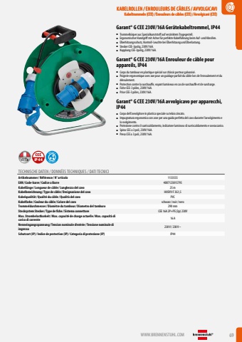 WWW.BRENNENSTUHL.COM 69KABELROLLEN /ENROULEURS DE C%u00c2BLES/ AVVOLGICAVIKabeltrommeln (CEE)/ Enrouleurs de c%u00e2bles (CEE)/ Avvolgicavi (CEE)KABELROLLEN /ENROULEURS DE C%u00c2BLES/ AVVOLGICAVIKabeltrommeln (CEE)/ Enrouleurs de c%u00e2bles (CEE)/ Avvolgicavi (CEE)KABELROLLEN /ENROULEURS DE C%u00c2BLES/ AVVOLGICAVIKabeltrommeln (CEE)/ Enrouleurs de c%u00e2bles (CEE)/ Avvolgicavi (CEE)Garant%u00ae G CEE 230V/16A Ger%u00e4tekabeltrommel, IP44%u25a0 Trommelk%u00f6rper aus Spezialkunststoff auf verzinktem Tragegestell.%u25a0 Ergonomischer Handgriff mit Achse f%u00fcr perfekte Kabelf%u00fchrung beim Auf- und Abrollen.%u25a0 %u00dcberhitzungsschutz, Kontroll-Leuchte bei %u00dcberhitzung und %u00dcberlastung.%u25a0 Stecker CEE-3polig, 230V/16A.%u25a0 Kupplung CEE-3polig, 230V/16A.Garant%u00ae G CEE 230V/16A Enrouleur de c%u00e2ble pour appareils, IP44%u25a0 Corps du tambour en plastique sp%u00e9cial sur ch%u00e2ssis porteur galvanis%u00e9.%u25a0 Poign%u00e9e ergonomique avec axe pour un guidage parfait du c%u00e2ble lors de l%u2019enroulement et du d%u00e9roulement.%u25a0 Protection contre la surchauffe, voyant lumineux en cas de surchauffe et de surcharge.%u25a0 Fiche CEE-3 p%u00f4les, 230V/16A.%u25a0 Prise CEE-3 p%u00f4les, 230V/16A.Garant%u00ae G CEE 230V/16A avvolgicavo per apparecchi, IP44%u25a0 Corpo dell%u2019avvolgitore in plastica speciale su telaio zincato.%u25a0 Impugnatura ergonomica con asse per una guida perfetta del cavo durante l%u2019avvolgimento e lo svolgimento.%u25a0 Protezione contro il surriscaldamento, indicatore luminoso di surriscaldamento e sovraccarico.%u25a0 Spina CEE a 3 poli, 230V/16A.%u25a0 Presa CEE a 3 poli, 230V/16A.IP44CEECEE 230 VCEE 230 VTECHNISCHE DATEN / DONN%u00c9ES TECHNIQUES / DATI TECNICIArtikelnummer/ R%u00e9f%u00e9rence / N%u00b0 articolo 1133555EAN/ Code-barre / Codice a Barre 4007123015795Kabell%u00e4nge / Longueur de c%u00e2ble / Lunghezza del cavo 25 mKabelbezeichnung / Type de c%u00e2ble / Designazione del cavo H05VV-F 3G1,5Kabelqualit%u00e4t/ Qualit%u00e9 du c%u00e2ble / Qualit%u00e0 del cavo PVCKabelfarbe / Couleur du c%u00e2ble / Colore del cavo schwarz/ noir/ neroTrommeldurchmesser/ Diam%u00e8tre du tambour/ Diametro del tamburo 290 mmStecksystem Stecker/ Type de fiche / Sistema connettore CEE 16A 2P+PE (3p) 230VMax. Strombelastbarkeit/ Max. capacit%u00e9 de charge actuelle / Max. capacit%u00e0 di carico di corrente 16 ANenneingangsspannung / Tension nominale d%u2019entr%u00e9e / Tensione nominale di ingresso 230 V / 230 V~Schutzart (IP)/ Indice de protection (IP)/ Categoria di protezione (IP) IP44