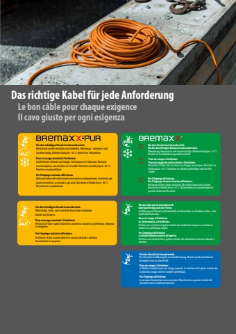 Le bon c%u00e2ble pour chaque exigence Das richtige Kabel f%u00fcr jede Anforderung Il cavo giusto per ogni esigenza N07: For outside use N05: For temporary outside use.Oil resistant. High mechanical loading capacity. Anti-freezing, remains highly flexible down to -35 %u00b0C. Outer cable casing made of highly flexible special plastic.For long-term outside use.Resistant against oils and acids. Inner wire coating made of natural or synthetic rubber. Outer cable casing made of neoprene.For long-term outside use. Withstands high mechanical loads and resists abrasion. Resistant to weather, microbes and acid. Cold-resistant to -40 %u00b0C. Polyurethane outer sleeve.For long-term outside use.Resistant against oils and acids. Inner wire coating made of natural or synthetic rubber. Outer cable casing made of neoprene.For long-term outside use. Withstands high mechanical loads and resists abrasion. Resistant to weather, microbes and acid. Cold-resistant to -40 %u00b0C. Polyurethane outer sleeve.F%u00fcr den st%u00e4ndigen Einsatz Aussenbereich.%u00d6lbest%u00e4ndig. Natur- oder Synthetik-Kautschuk-Isolierh%u00fclle. Mantel aus Neopren.F%u00fcr den st%u00e4ndigen Einsatz im Aussenbereich. Mechanisch extrem belastbar und abriebfest. Witterungs-, mikrobenund s%u00e4urebest%u00e4ndig. K%u00e4ltebest%u00e4ndig bis -40 %u00b0C. Mantel aus Polyurethan.BQRN RRV3V3VVF%u00fcr den st%u00e4ndigen Einsatz im Aussenbereich. Mechanisch extrem belastbar und abriebfest. Witterungs-, mikroben- und s%u00e4urebest%u00e4ndig. K%u00e4ltebest%u00e4ndig bis -40 %u00b0C. Mantel aus Polyurethan.Pour un usage constant %u00e0 l'ext%u00e9rieur. Extr%u00eamement r%u00e9sistant aux charges m%u00e9caniques et %u00e0 l'abrasion. R%u00e9sistant aux intemp%u00e9ries, aux microbes et %u00e0 l'acidit%u00e9. R%u00e9sistant au froid jusqu'%u00e0 -40%u00b0%u00a0C. Manteau en polyur%u00e9thane.Per l%u2019impiego costante all%u2019esterno. Molto resistente alle sollecitazioni meccaniche e al piegamento. Resistente agli agenti atmosferici, ai microbi e agli acidi. Resistente al freddo fino a -40%u00b0 C. Rivestimento in poliuretano.Per l%u2019impiego costante all%u2019esterno.Resistente all%u2019olio. Guaine isolanti in caucci%u00f9 naturale o sintetico. Rivestimento in neoprene.Pour un usage constant %u00e0 l%u2019ext%u00e9rieur.R%u00e9sistant %u00e0 l%u2019huile. Gaine isolante en caoutchouc naturel ou synth%u00e9tique. Manteau en n%u00e9opr%u00e8ne.F%u00fcr den st%u00e4ndigen Einsatz Aussenbereich.%u00d6lbest%u00e4ndig. Natur- oder Synthetik-Kautschuk-Isolierh%u00fclle. Mantel aus Neopren.N07: F%u00fcr den Einsatz im Aussenbereich. N05: F%u00fcr den kurzfristigen Einsatz im Aussenbereich.%u00d6lbest%u00e4ndig. Mechanisch sehr hoch belastbar. K%u00e4ltebest%u00e4ndig bis -35 %u00b0C. Mantel aus hochflexiblem Spezialkunststoff.N07%u00a0: Pour un usage %u00e0 l%u2019ext%u00e9rieur. N05%u00a0: Pour un usage de courte dur%u00e9e %u00e0 l%u2019ext%u00e9rieur.R%u00e9sistant %u00e0 l%u2019huile. Tr%u00e8s r%u00e9sistant aux charges m%u00e9caniques. R%u00e9sistant au froid jusqu%u2019%u00e0 -35%u00b0%u00a0C. Manteau en mati%u00e8re synth%u00e9tique sp%u00e9ciale tr%u00e8s souple.N07: Per l%u2019impiego all%u2019esterno. N05: Per l%u2019impiego a breve termine all%u2019esterno.Resistente all%u2019olio. Molto resistente alle sollecitazioni meccaniche. Resistente al freddo fino a -35%u00b0 C. Rivestimento in materiale plastico speciale altamente flessibile.F%u00fcr den Einsatz im Innenbereich und kurzfristig auch im Freien. Ausf%u00fchrung mit Mantel und Isolierh%u00fclle der Einzelader aus flexiblem Natur- oder Synthetik-Kautschuk.Pour un usage %u00e0 l'int%u00e9rieur et, bri%u00e8vement, %u00e0 l'ext%u00e9rieur. Finition avec manteau et gaine isolante du conducteur unique en caoutchouc naturel ou synth%u00e9tique souple.Per l%u2019impiego all%u2019interno e a breve termine anche all%u2019aperto. Versione con rivestimento e guaina isolante del caricatore in caucci%u00f9 naturale o sintetico.F%u00fcr den Einsatz im Innenbereich Die Standard-Ausf%u00fchrung f%u00fcr normale Belastung. Mantel und Isolierh%u00fclle der Einzelader sind aus Kunststoff.Pour un usage %u00e0 l%u2019int%u00e9rieur La finition standard pour une charge normale. Le manteau et la gaine isolante du conducteur unique sont en mati%u00e8re synth%u00e9tique.Per l%u2019impiego all%u2019interno La versione standard per carico normale. Rivestimento e guaina isolante del caricatore sono in materiale plastico.