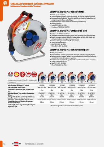 76 WWW.BRENNENSTUHL.COMKABELROLLEN /ENROULEURS DE C%u00c2BLES/ AVVOLGICAVIKabeltrommeln / Enrouleurs de c%u00e2bles/ AvvolgicaviKABELROLLEN /ENROULEURS DE C%u00c2BLES/ AVVOLGICAVIKabeltrommeln / Enrouleurs de c%u00e2bles/ AvvolgicaviKABELROLLEN /ENROULEURS DE C%u00c2BLES/ AVVOLGICAVIKabeltrommeln / Enrouleurs de c%u00e2bles/ AvvolgicaviGarant%u00ae SK T13/3 (IP55) Kabeltrommel%u25a0 Ideal f%u00fcr den Ausseneinsatz.%u25a0 Trommelk%u00f6rper aus Stahlblech, rostgesch%u00fctzt verzinkt, auf besonders stabilem Tragegestell.%u25a0 Innovativer Tragegriff %u201ecablepilot%u201c f%u00fcr perfekte Kabelf%u00fchrung. Pendelt auf beiden Seiten und erm%u00f6glicht bequemes Tragen und Aufh%u00e4ngen.%u25a0 %u00dcberhitzungsschutz, Kontroll-Leuchte bei %u00dcberhitzung und %u00dcberlastung.%u25a0 CH Stecksystem IP55.%u25a0 Stecker T13/3, 230V, 10A (IP55).%u25a0 3 Steckdosen T13/3, 230V, 10A (IP55).Garant%u00ae SK T13/3 (IP55) Enrouleur de c%u00e2ble%u25a0 id%u00e9al pour une utilisation en ext%u00e9rieur.%u25a0 Tambour en acier, galvanis%u00e9, inoxydable avec un cadre de transport particuli%u00e8rement stable.%u25a0 Poign%u00e9e de transport innovante Cablepilot%u00ae pour un guidage parfait du c%u00e2ble. Bascule des 2 c%u00f4t%u00e9s permettant ainsi un transport et une accroche facile.%u25a0 Protection thermique contre la surchauffe et la surcharge.%u25a0 Syst%u00e8me de connexion CH IP55.%u25a0 Fiche T13/3, 230V, 10A (IP55).%u25a0 3 Prises T13/3, 230V, 10A (IP55).Garant%u00ae SK T13/3 (IP55) Tamburo avvolgicavo%u25a0 Ideale per l%u2019uso esterno.%u25a0 Corpo del tamburo in lamiera d%u2018acciaio zincata antiruggine, collocato su supporto metallico.%u25a0 Innovativo manico di trasporto %u201ccablepilot%u201d per un posizionamento cavo perfetto. Oscillante su entrambi i lati, comodo da trasportare e appendere.%u25a0 Protezione anti surriscaldamento, spia di controllo in caso di surriscaldamento e sovraccarico.%u25a0 Sistema di connessione CH IP55.%u25a0 Spina T13/3, 230V, 10A (IP55).%u25a0 3 Prese T13/3, 230V, 10A (IP55).ROBUSTSPECIALCH/T13IP55TECHNISCHE DATEN / DONN%u00c9ES TECHNIQUES / DATI TECNICIArtikelnummer/ R%u00e9f%u00e9rence / N%u00b0 articolo 1197052831 1197282832 1197102831 1197302832 1197062831 1197322832EAN/ Code-barre / Codice a Barre 4007123311880 4007123311910 4007123311903 4007123311927 4007123311897 4007123311941Kabell%u00e4nge / Longueur de c%u00e2ble / Lunghezza del cavo25 m 25 m 33 m 33 m 50 m 50 mKabelbezeichnung / Type de c%u00e2ble / Designazione del cavoAT-N07V3V3-F 3G1,5AT-N07V3V3-F 3G2,5AT-N07V3V3-F 3G1,5AT-N07V3V3-F 3G2,5AT-N07V3V3-F 3G1,5AT-N07V3V3-F 3G2,5Kabelqualit%u00e4t/ Qualit%u00e9 du c%u00e2ble / Qualit%u00e0 del cavo BREMAXX BREMAXX BREMAXX BREMAXX BREMAXX BREMAXXKabelfarbe / Couleur du c%u00e2ble / Colore del cavo orange/ arancione orange/ arancione orange/ arancione orange/ arancione orange/ arancione orange/ arancioneTrommeldurchmesser/ Diam%u00e8tre du tambour/ Diametro del tamburo 240 mm 290 mm 290 mm 290 mm 290 mm 320 mmSchutzart (IP)/ Indice de protection (IP)/ Categoria di protezione (IP) Steckverbindung CH IP55/ Connexion CH IP55/ Connettore CH IP55