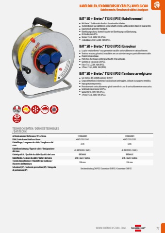 WWW.BRENNENSTUHL.COM 77KABELROLLEN /ENROULEURS DE C%u00c2BLES/ AVVOLGICAVIKabeltrommeln / Enrouleurs de c%u00e2bles/ AvvolgicaviKABELROLLEN /ENROULEURS DE C%u00c2BLES/ AVVOLGICAVIKabeltrommeln / Enrouleurs de c%u00e2bles/ AvvolgicaviKABELROLLEN /ENROULEURS DE C%u00c2BLES/ AVVOLGICAVIKabeltrommeln / Enrouleurs de c%u00e2bles/ AvvolgicaviBAT%u00ae SK + Bretec%u00ae T13/3 (IP55) Kabeltrommel%u25a0 Mit Bretec%u00ae Drehkontakt-Komfort f%u00fcr rationelles Arbeiten.%u25a0 Trommelk%u00f6rper aus Stahlblech, rostgesch%u00fctzt verzinkt, auf besonders stabilem Tragegestell.%u25a0 Ergonomisch geformter Handgriff.%u25a0 %u00dcberhitzungsschutz, Kontroll-Leuchte bei %u00dcberhitzung und %u00dcberlastung.%u25a0 CH Stecksystem IP55.%u25a0 Stecker T13/3, 230V, 10A (IP55).%u25a0 3 Steckdosen T13/3, 230V, 10A (IP55).BAT%u00ae SK + Bretec%u00ae T13/3 (IP55) Enrouleur%u25a0 La prise rotative Bretec%u00ae vous permet de travailler confortablement et rationnellement.%u25a0 Tambour en acier, galvanis%u00e9, inoxydable avec un cadre de transport particuli%u00e8rement stable.%u25a0 Poign%u00e9e ergonomique.%u25a0 Protection thermique contre la surchauffe et la surcharge.%u25a0 Syst%u00e8me de connexion CH IP55.%u25a0 Fiche T13/3, 230V, 10A (IP55).%u25a0 3 Prises T13/3, 230V, 10A (IP55).BAT%u00ae SK + Bretec%u00ae T13/3 (IP55) Tamburo avvolgicavo%u25a0 Con tecnica del contatto girevole Bretec%u00ae.%u25a0 Corpo del tamburo in lamiera d%u2019acciaio zincata antiruggine, collocato su supporto metallico.%u25a0 Impugnatura ergonomica.%u25a0 Protezione anti surriscaldamento, spia di controllo in caso di surriscaldamento e sovraccarico.%u25a0 Sistema di connessione CH IP55.%u25a0 Spina T13/3, 230V, 10A (IP55).%u25a0 3 Prese T13/3, 230V, 10A (IP55).ROBUSTSPECIALBRETEC%u00aeBRETEC%u00aeCH/T13IP55TECHNISCHE DATEN / DONN%u00c9ES TECHNIQUES / DATI TECNICIArtikelnummer/ R%u00e9f%u00e9rence / N%u00b0 articolo 1198822801 1198842801EAN/ Code-barre / Codice a Barre 4007123312245 4007123312252Kabell%u00e4nge / Longueur de c%u00e2ble / Lunghezza del cavo33 m 50 mKabelbezeichnung / Type de c%u00e2ble / Designazione del cavo AT-N07V3V3-F 3G1,5 AT-N07V3V3-F 3G1,5Kabelqualit%u00e4t/ Qualit%u00e9 du c%u00e2ble / Qualit%u00e0 del cavo BREMAXX BREMAXXKabelfarbe / Couleur du c%u00e2ble / Colore del cavo gelb/ jaune/ gialloa gelb/ jaune/ gialloaTrommeldurchmesser/ Diam%u00e8tre du tambour/ Diametro del tamburo 290 mm 290 mmSchutzart (IP)/ Indice de protection (IP)/ Categoria di protezione (IP) Steckverbindung CH IP55/ Connexion CH IP55/ Connettore CH IP55