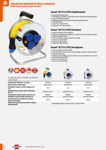 78 WWW.BRENNENSTUHL.COMKABELROLLEN /ENROULEURS DE C%u00c2BLES/ AVVOLGICAVIKabeltrommeln / Enrouleurs de c%u00e2bles/ AvvolgicaviKABELROLLEN /ENROULEURS DE C%u00c2BLES/ AVVOLGICAVIKabeltrommeln / Enrouleurs de c%u00e2bles/ AvvolgicaviKABELROLLEN /ENROULEURS DE C%u00c2BLES/ AVVOLGICAVIKabeltrommeln / Enrouleurs de c%u00e2bles/ AvvolgicaviGarant%u00ae SK T13/3 (IP55) Kabeltrommel%u25a0 Ideal f%u00fcr den belastbaren Einsatz.%u25a0 Trommelk%u00f6rper aus Stahlblech, rostgesch%u00fctzt verzinkt, auf besonders stabilem Tragegestell.%u25a0 Ergonomisch geformter Handgriff.%u25a0 %u00dcberhitzungsschutz, Kontroll-Leuchte bei %u00dcberhitzung und %u00dcberlastung.%u25a0 CH Stecksystem IP55.%u25a0 Stecker T13/3, 230V, 10A (IP55).%u25a0 3 Steckdosen T13/3, 230V, 10A (IP55).Garant%u00ae SK T13/3 (IP55) Enrouleur%u25a0 Id%u00e9al pour l%u2019utilisation en milieux difficiles.%u25a0 Tambour en acier, galvanis%u00e9, inoxydable avec un cadre de transport particuli%u00e8rement stable.%u25a0 Poign%u00e9e ergonomique moul%u00e9e.%u25a0 Protection thermique contre la surchauffe et la surcharge.%u25a0 Syst%u00e8me de connexion CH IP55.%u25a0 Fiche T13/3, 230V, 10A (IP55).%u25a0 3 Prises T13/3, 230V, 10A (IP55).Garant%u00ae SK T13/3 (IP55) Avvolgicavo%u25a0 Ideale per l%u2019impiego in condizioni difficil.%u25a0 Corpo del tamburo in lamiera d%u2019acciaio zincata antiruggine, collocato su supporto metallico.%u25a0 Impugnatura ergonomica.%u25a0 Protezione anti surriscaldamento, spia di controllo in caso di surriscaldamento e sovraccarico.%u25a0 Sistema di connessione CH IP55.%u25a0 Spina T13/3, 230V, 10A (IP55).%u25a0 3 Prese T13/3, 230V, 10A (IP55).ROBUSTSPECIALCH/T13IP55TECHNISCHE DATEN / DONN%u00c9ES TECHNIQUES / DATI TECNICIArtikelnummer/ R%u00e9f%u00e9rence / N%u00b0 articolo 1195022831 1195042831 1195052831EAN/ Code-barre / Codice a Barre 4007123312146 4007123312153 4007123312160Kabell%u00e4nge / Longueur de c%u00e2ble / Lunghezza del cavo25 m 33 m 50 mKabelbezeichnung / Type de c%u00e2ble / Designazione del cavo AT-N07V3V3-F 3G1,5 AT-N07V3V3-F 3G1,5 AT-N07V3V3-F 3G1,5Kabelqualit%u00e4t/ Qualit%u00e9 du c%u00e2ble / Qualit%u00e0 del cavo BREMAXX BREMAXX BREMAXXKabelfarbe / Couleur du c%u00e2ble / Colore del cavo gelb/ jaune/ gialloa gelb/ jaune/ gialloa gelb/ jaune/ gialloaTrommeldurchmesser/ Diam%u00e8tre du tambour/ Diametro del tamburo 240 mm 290 mm 290 mmSchutzart (IP)/ Indice de protection (IP)/ Categoria di protezione (IP) Steckverbindung CH IP55/ Connexion CH IP55/ Connettore CH IP55