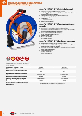 80 WWW.BRENNENSTUHL.COMKABELROLLEN /ENROULEURS DE C%u00c2BLES/ AVVOLGICAVIKabeltrommeln / Enrouleurs de c%u00e2bles/ AvvolgicaviKABELROLLEN /ENROULEURS DE C%u00c2BLES/ AVVOLGICAVIKabeltrommeln / Enrouleurs de c%u00e2bles/ AvvolgicaviKABELROLLEN /ENROULEURS DE C%u00c2BLES/ AVVOLGICAVIKabeltrommeln / Enrouleurs de c%u00e2bles/ AvvolgicaviGarant%u00ae G 320 T13/3 (IP55) Ger%u00e4tekabeltrommel%u25a0 Trommelk%u00f6rper aus Spezialkunststoff auf verzinktem Tragegestell.%u25a0 Innovativer Tragegriff %u201ecablepilot%u201c f%u00fcr perfekte Kabelf%u00fchrung. Pendelt auf beiden Seiten und erm%u00f6glicht bequemes Tragen und Aufh%u00e4ngen.%u25a0 %u00dcberhitzungsschutz, Kontroll-Leuchte bei %u00dcberhitzung und %u00dcberlastung.%u25a0 Ideal zum Rasenm%u00e4hen, Heckenschneiden usw.%u25a0 CH Stecksystem IP55.%u25a0 Stecker T13/3, 230V, 10A (IP55).%u25a0 Kupplung T13/3, 230V, 10A (IP55).Garant%u00ae G 320 T13/3 (IP55) Enrouleur de c%u00e2ble pour appareils%u25a0 Corps du tambour en mati%u00e8re plastique sp%u00e9ciale sur un ch%u00e2ssis galvanis%u00e9.%u25a0 Poign%u00e9e de transport innovante Cablepilot%u00ae pour un guidage parfait du c%u00e2ble. Bascule des 2 c%u00f4t%u00e9s permettant ainsi un transport et une accroche facile.%u25a0 Protection thermique contre la surchauffe et la surcharge.%u25a0 Id%u00e9al pour tondre le gazon, couper les haies etc.%u25a0 Syst%u00e8me de connexion CH IP55.%u25a0 Fiche T13/3, 230V, 10A (IP55).%u25a0 Prise T13/3, 230V, 10A (IP55).Garant%u00ae G 320 T13/3 (IP55) Avvolgicavo per appareci%u25a0 Corpo del tamburo in plastica speciale, collocato su supporto metallico.%u25a0 Innovativo manico di trasporto %u201ccablepilot%u201d per un posizionamento cavo perfetto. Oscillante su entrambi i lati, comodo da trasportare e appendere.%u25a0 Protezione anti surriscaldamento, spia di controllo in caso di surriscaldamento e sovraccarico.%u25a0 Ideale per tagliare l%u2019erba, le siepi, ecc.%u25a0 Sistema di connessione CH IP55.%u25a0 Spina T13/3, 230V, 10A (IP55).%u25a0 Presa T13/3, 230V, 10A (IP55).ROBUSTSPECIALCH/T13IP55TECHNISCHE DATEN / DONN%u00c9ES TECHNIQUES / DATI TECNICIArtikelnummer/ R%u00e9f%u00e9rence / N%u00b0 articolo 1235812832 1235812831EAN/ Code-barre / Codice a Barre 4007123312528 4007123312009Kabell%u00e4nge / Longueur de c%u00e2ble / Lunghezza del cavo33 m 60 mKabelbezeichnung / Type de c%u00e2ble / Designazione del cavo AT-N07V3V3-F 3G2,5 AT-N07V3V3-F 3G1,5Kabelqualit%u00e4t/ Qualit%u00e9 du c%u00e2ble / Qualit%u00e0 del cavo BREMAXX BREMAXXKabelfarbe / Couleur du c%u00e2ble / Colore del cavo orange/ arancione orange/ arancioneTrommeldurchmesser/ Diam%u00e8tre du tambour/ Diametro del tamburo 320 mm 320 mmSchutzart (IP)/ Indice de protection (IP)/ Categoria di protezione (IP) Steckverbindung CH IP55/ Connexion CH IP55/ Connettore CH IP55