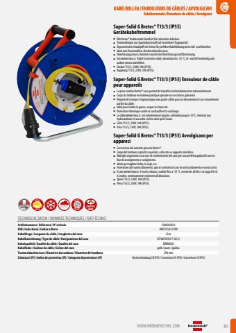 WWW.BRENNENSTUHL.COM 81KABELROLLEN /ENROULEURS DE C%u00c2BLES/ AVVOLGICAVIKabeltrommeln / Enrouleurs de c%u00e2bles/ AvvolgicaviKABELROLLEN /ENROULEURS DE C%u00c2BLES/ AVVOLGICAVIKabeltrommeln / Enrouleurs de c%u00e2bles/ AvvolgicaviKABELROLLEN /ENROULEURS DE C%u00c2BLES/ AVVOLGICAVIKabeltrommeln / Enrouleurs de c%u00e2bles/ AvvolgicaviSuper-Solid G Bretec%u00ae T13/3 (IP55) Ger%u00e4tekabeltrommel%u25a0 Mit Bretec%u00ae Drehkontakt-Komfort f%u00fcr rationelles Arbeiten.%u25a0 Trommelk%u00f6rper aus Spezialkunststoff auf verzinktem Tragegestell.%u25a0 Ergonomischer Handgriff mit Achse f%u00fcr perfekte Kabelf%u00fchrung beim Auf- und Abrollen.%u25a0 Ideal zum Rasenm%u00e4hen, Heckenschneiden usw.%u25a0 %u00dcberhitzungsschutz, Kontroll-Leuchte bei %u00dcberhitzung und %u00dcberlastung.%u25a0 Das %uf006%uf007%uf008 Kabel ist extrem stabil, einsetzbar bis -35 %u00b0C, %u00f6l- und UV-best%u00e4ndig und zudem extrem abriebfest.%u25a0 Stecker T13/3, 230V, 10A (IP55).%u25a0 Kupplung T13/3, 230V, 10A (IP55).Super-Solid G Bretec%u00ae T13/3 (IP55) Enrouleur de c%u00e2ble pour appareils%u25a0 La prise rotative Bretec%u00ae vous permet de travailler confortablement et rationnellement.%u25a0 Corps du tambour en mati%u00e8re plastique sp%u00e9ciale sur un ch%u00e2ssis galvanis%u00e9.%u25a0 Poign%u00e9e de transport ergonomique avec guide-c%u00e2ble pour un d%u00e9roulement et un enroulement parfait du c%u00e2ble.%u25a0 Id%u00e9al pour tondre le gazon, couper les haies etc.%u25a0 Protection thermique contre la surchauffe et la surcharge.%u25a0 Le c%u00e2ble %uf006%uf007%uf008 est extr%u00eamement robuste, utilisable jusqu%u2019%u00e0 -35%u00b0C, r%u00e9sistant aux hydrocarbures et aux ultra-violets ainsi qu%u2019%u00e0 l%u2019usure.%u25a0 Fiche T13/3, 230V, 10A (IP55).%u25a0 Prise T13/3, 230V, 10A (IP55).Super-Solid G Bretec%u00ae T13/3 (IP55) Avvolgicavo per appareci%u25a0 Con tecnica del contatto girevole Bretec%u00ae.%u25a0 Corpo del tamburo in plastica speciale, collocato su supporto metallico.%u25a0 Maniglia ergonomica con asse di contenimento del cavo per una perfetta guida del cavo in fase di avvolgimento e svolgimento.%u25a0 Ideale per tagliare l%u2019erba, le siepi, ecc.%u25a0 Protezione anti surriscaldamento, spia di controllo in caso di surriscaldamento e sovraccarico.%u25a0 Il cavo %uf006%uf007%uf008 %u00e8 molto robusto, usabile fino a -35 %u00b0C, resistente all%u2019olio e ai raggi UV ed %u00e8, inoltre, estremamente resistente all%u2019abrasione.%u25a0 Spina T13/3, 230V, 10A (IP55).%u25a0 Presa T13/3, 230V, 10A (IP55).ROBUSTSPECIALBRETEC%u00aeBRETEC%u00aeCH/T13IP55TECHNISCHE DATEN / DONN%u00c9ES TECHNIQUES / DATI TECNICIArtikelnummer/ R%u00e9f%u00e9rence / N%u00b0 articolo 1308302831EAN/ Code-barre / Codice a Barre 4007123312290Kabell%u00e4nge / Longueur de c%u00e2ble / Lunghezza del cavo 33 mKabelbezeichnung / Type de c%u00e2ble / Designazione del cavo AT-N07V3V3-F 3G1,5Kabelqualit%u00e4t/ Qualit%u00e9 du c%u00e2ble / Qualit%u00e0 del cavo BREMAXXKabelfarbe / Couleur du c%u00e2ble / Colore del cavo gelb/ jaune/ gialloaTrommeldurchmesser/ Diam%u00e8tre du tambour/ Diametro del tamburo 290 mmSchutzart (IP)/ Indice de protection (IP)/ Categoria di protezione (IP) Steckverbindung CH IP55/ Connexion CH IP55/ Connettore CH IP55