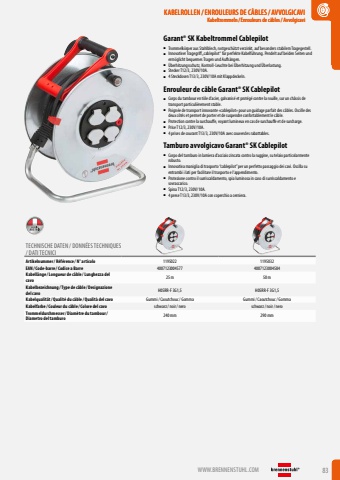 WWW.BRENNENSTUHL.COM 83KABELROLLEN /ENROULEURS DE C%u00c2BLES/ AVVOLGICAVIKabeltrommeln / Enrouleurs de c%u00e2bles/ AvvolgicaviKABELROLLEN /ENROULEURS DE C%u00c2BLES/ AVVOLGICAVIKabeltrommeln / Enrouleurs de c%u00e2bles/ AvvolgicaviKABELROLLEN /ENROULEURS DE C%u00c2BLES/ AVVOLGICAVIKabeltrommeln / Enrouleurs de c%u00e2bles/ AvvolgicaviGarant%u00ae SK Kabeltrommel Cablepilot%u25a0 Trommelk%u00f6rper aus Stahlblech, rostgesch%u00fctzt verzinkt, auf besonders stabilem Tragegestell.%u25a0 Innovativer Tragegriff %u201ecablepilot%u201c f%u00fcr perfekte Kabelf%u00fchrung. Pendelt auf beiden Seiten und erm%u00f6glicht bequemes Tragen und Aufh%u00e4ngen.%u25a0 %u00dcberhitzungsschutz, Kontroll-Leuchte bei %u00dcberhitzung und %u00dcberlastung.%u25a0 Stecker T12/3, 230V/10A.%u25a0 4 Steckdosen T13/3, 230V/10A mit Klappdeckeln.Enrouleur de c%u00e2ble Garant%u00ae SK Cablepilot%u25a0 Corps du tambour en t%u00f4le d%u2019acier, galvanis%u00e9 et prot%u00e9g%u00e9 contre la rouille, sur un ch%u00e2ssis de transport particuli%u00e8rement stable.%u25a0 Poign%u00e9e de transport innovante %u00abcablepilot%u00bb pour un guidage parfait des c%u00e2bles. Oscille des deux c%u00f4t%u00e9s et permet de porter et de suspendre confortablement le c%u00e2ble.%u25a0 Protection contre la surchauffe, voyant lumineux en cas de surchauffe et de surcharge.%u25a0 Prise T12/3, 230V/10A.%u25a0 4 prises de courant T13/3, 230V/10A avec couvercles rabattables.Tamburo avvolgicavo Garant%u00ae SK Cablepilot%u25a0 Corpo del tamburo in lamiera d%u2019acciaio zincata contro la ruggine, su telaio particolarmente robusto.%u25a0 Innovativa maniglia di trasporto %u201ccablepilot%u201d per un perfetto passaggio dei cavi. Oscilla su entrambi i lati per facilitare il trasporto e l%u2019appendimento.%u25a0 Protezione contro il surriscaldamento, spia luminosa in caso di surriscaldamento e sovraccarico.%u25a0 Spina T12/3, 230V/10A.%u25a0 4 prese T13/3, 230V/10A con coperchio a cerniera.TECHNISCHE DATEN / DONN%u00c9ES TECHNIQUES / DATI TECNICIArtikelnummer/ R%u00e9f%u00e9rence / N%u00b0 articolo 1195022 1195032EAN/ Code-barre / Codice a Barre 4007123004577 4007123004584Kabell%u00e4nge / Longueur de c%u00e2ble / Lunghezza del cavo25 m 50 mKabelbezeichnung / Type de c%u00e2ble / Designazione del cavo H05RR-F 3G1,5 H05RR-F 3G1,5Kabelqualit%u00e4t/ Qualit%u00e9 du c%u00e2ble / Qualit%u00e0 del cavo Gummi/ Caoutchouc/ Gomma Gummi/ Caoutchouc/ GommaKabelfarbe / Couleur du c%u00e2ble / Colore del cavo schwarz/ noir/ nero schwarz/ noir/ neroTrommeldurchmesser/ Diam%u00e8tre du tambour/ Diametro del tamburo 240 mm 290 mm
