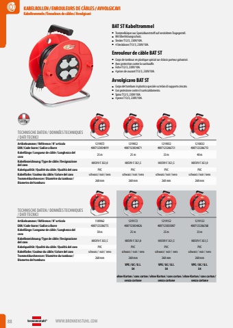 88 WWW.BRENNENSTUHL.COMKABELROLLEN /ENROULEURS DE C%u00c2BLES/ AVVOLGICAVIKabeltrommeln / Enrouleurs de c%u00e2bles/ AvvolgicaviKABELROLLEN /ENROULEURS DE C%u00c2BLES/ AVVOLGICAVIKabeltrommeln / Enrouleurs de c%u00e2bles/ AvvolgicaviKABELROLLEN /ENROULEURS DE C%u00c2BLES/ AVVOLGICAVIKabeltrommeln / Enrouleurs de c%u00e2bles/ AvvolgicaviBAT ST Kabeltrommel%u25a0 Trommelk%u00f6rper aus Spezialkunststoff auf verzinktem Tragegestell.%u25a0 Mit %u00dcberhitzungsschutz.%u25a0 Stecker T12/3, 230V/10A.%u25a0 4 Steckdosen T13/3, 230V/10A.Enrouleur de c%u00e2ble BAT ST%u25a0 Corps de tambour en plastique sp%u00e9cial sur ch%u00e2ssis porteur galvanis%u00e9.%u25a0 Avec protection contre la surchauffe.%u25a0 Fiche T12/3, 230V/10A.%u25a0 4 prises de courant T13/3, 230V/10A.Avvolgicavo BAT ST%u25a0 Corpo del tamburo in plastica speciale su telaio di supporto zincato.%u25a0 Con protezione contro il surriscaldamento.%u25a0 Spina T12/3, 230V/10A.%u25a0 4 prese T13/3, 230V/10A.TECHNISCHE DATEN / DONN%u00c9ES TECHNIQUES / DATI TECNICIArtikelnummer/ R%u00e9f%u00e9rence / N%u00b0 articolo 1219072 1219052 1219032 1218032EAN/ Code-barre / Codice a Barre 4007123034819 4007123034871 4007123286751 4007123286713Kabell%u00e4nge / Longueur de c%u00e2ble / Lunghezza del cavo25 m 25 m 33 m 40 mKabelbezeichnung / Type de c%u00e2ble / Designazione del cavo H05VV-F 3G1,0 H05VV-F 3G1,5 H05VV-F 3G1,5 H05VV-F 3G1,0Kabelqualit%u00e4t/ Qualit%u00e9 du c%u00e2ble / Qualit%u00e0 del cavo PVC PVC PVC PVCKabelfarbe / Couleur du c%u00e2ble / Colore del cavo schwarz/ noir/ nero schwarz/ noir/ nero schwarz/ noir/ nero schwarz/ noir/ neroTrommeldurchmesser/ Diam%u00e8tre du tambour/ Diametro del tamburo 260 mm 260 mm 260 mm 260 mmTECHNISCHE DATEN / DONN%u00c9ES TECHNIQUES / DATI TECNICIArtikelnummer/ R%u00e9f%u00e9rence / N%u00b0 articolo 1189062 1219172 1219152 1219132EAN/ Code-barre / Codice a Barre 4007123286775 4007123034826 4007123035007 4007123286768Kabell%u00e4nge / Longueur de c%u00e2ble / Lunghezza del cavo50 m 25 m 25 m 33 mKabelbezeichnung / Type de c%u00e2ble / Designazione del cavo H05VV-F 3G1,5 H05VV-F 3G1,0 H05VV-F 3G1,5 H05VV-F 3G1,5Kabelqualit%u00e4t/ Qualit%u00e9 du c%u00e2ble / Qualit%u00e0 del cavo PVC PVC PVC PVCKabelfarbe / Couleur du c%u00e2ble / Colore del cavo schwarz/ noir/ nero schwarz/ noir/ nero schwarz/ noir/ nero schwarz/ noir/ neroTrommeldurchmesser/ Diam%u00e8tre du tambour/ Diametro del tamburo 260 mm 260 mm 260 mm 260 mmVPE / UC / U.I. 54ohne Karton / sans carton / senza cartone VPE / UC / U.I. 54ohne Karton / sans carton / senza cartone VPE / UC / U.I. 54ohne Karton / sans carton / senza cartone