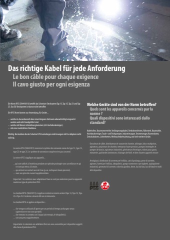 Enrouleurs de c%u00e2ble, distributeurs de courant de chantier, rallonges, blocs multiprises, agitateurs, projecteurs de chantier, nettoyeurs haute pression, pompes immerg%u00e9es et pompes de bassin, aspirateurs industriels, g%u00e9n%u00e9rateurs %u00e9lectriques, robots pour gazon, minuteries, guirlandes lumineuses, %u00e9clairages de No%u00ebl, et bien d%u2018autres appareils encoreKabelrollen, Baustromverteiler, Verl%u00e4ngerungskabel, Steckdosenleisten, R%u00fchrwerk, Baustrahler, Hochdruckreiniger, Tauch- und Teichpumpen, Industriesauger, Stromerzeuger, Rasenroboter, Zeitschaltuhren, Lichterketten, Weihnachtsbeleuchtung, und viele weitere Ger%u00e4te.Welche Ger%u00e4te sind von der Norm betroffen?Quels sont les appareils concern%u00e9s par la norme ?Die Norm IP55 (SN441011) betrifft das Schweizer Stecksystem Typ 13, Typ 15, Typ 23 und Typ 25. Das EU Stecksystem ist davon nicht betroffenDie IP55 Norm kommt zur Anwendung, f%u00fcr Ger%u00e4te...... welche im Aussenbereich %u00fcber einen l%u00e4ngeren Zeitraum unbeaufsichtigt eingesetzt werden und nicht handgef%u00fchrt sind.... welche mit Wasser in Ber%u00fchrung kommen (z.B. Hochdruckreiniger).... mit einer zus%u00e4tzlichen Steckdose.Wichtig: Bei Ger%u00e4ten die der Schutzart IP55 unterliegen sind L%u00f6sungen mit Fix-Adaptern nicht zul%u00e4ssig. La norme IP55 (SN441011) concerne le syst%u00e8me de connexion suisse de type 13, type 15, type 23 et type 25. Le syst%u00e8me de connexion europ%u00e9en n%u2018est pas concern%u00e9.La norme IP55 s%u2018applique aux appareils...... qui sont utilis%u00e9s %u00e0 l%u2018ext%u00e9rieur pendant une p%u00e9riode prolong%u00e9e sans surveillance et qui ne sont pas tenus %u00e0 la main. ... qui entrent en contact avec de l%u2018eau (p. ex. nettoyeurs haute pression). ... avec une prise de courant suppl%u00e9mentaire. Important : les solutions avec adaptateurs fixes ne sont pas autoris%u00e9es pour les appareils soumis au type de protection IP55. Lo standard IP55 (SN441011) si applica ai sistemi a innesto svizzeri Tipo 13, Tipo 15, Tipo 23 e Tipo 25. Il sistema a innesto UE non %u00e8 interessato. Lo standard IP55 si applica ai dispositivi... ... che vengono utilizzati all%u2018aperto per un periodo di tempo prolungato senza supervisione e non sono portatili. ... che entrano in contatto con l%u2018acqua (ad esempio, le idropulitrici). ... con una presa supplementare. Importante: le soluzioni con adattatori fissi non sono consentite per i dispositivi soggetti alla classe di protezione IP55.Quali dispositivi sono interessati dallo standard?Avvolgicavi, distributori di corrente per l%u2018edilizia, cavi di prolunga, prese di corrente, agitatori, faretti per l%u2018edilizia, idropulitrici, pompe sommerse e per laghetti, aspirapolvere industriali, generatori di corrente, robot da giardino, timer, luci da fata, luci di Natale e molti altri dispositivi.Le bon c%u00e2ble pour chaque exigence Das richtige Kabel f%u00fcr jede Anforderung Il cavo giusto per ogni esigenza IP55