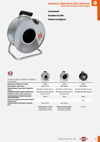 WWW.BRENNENSTUHL.COM 97KABELROLLEN /ENROULEURS DE C%u00c2BLES/ AVVOLGICAVIKabeltrommeln / Enrouleurs de c%u00e2bles/ AvvolgicaviKABELROLLEN /ENROULEURS DE C%u00c2BLES/ AVVOLGICAVIKabeltrommeln / Enrouleurs de c%u00e2bles/ AvvolgicaviLeertrommelEnrouleur de c%u00e2bleTamburo avvolgicavoTECHNISCHE DATEN / DONN%u00c9ES TECHNIQUES / DATI TECNICIArtikelnummer/ R%u00e9f%u00e9rence / N%u00b0 articolo 1195010 1194742 1206012EAN/ Code-barre / Codice a Barre 4007123312139 4007123302673 4007123030323Kabelbezeichnung / Type de c%u00e2ble / Designazione del cavoOhne Kabel/ Sans c%u00e2ble/ Senza cavo Ohne Kabel/ Sans c%u00e2ble/ Senza cavo Ohne Kabel/ Sans c%u00e2ble/ Senza cavoKabelqualit%u00e4t/ Qualit%u00e9 du c%u00e2ble / Qualit%u00e0 del cavo Ohne Kabel/ Sans c%u00e2ble/ Senza cavo Ohne Kabel/ Sans c%u00e2ble/ Senza cavo Ohne Kabel/ Sans c%u00e2ble/ Senza cavoKabelfarbe / Couleur du c%u00e2ble / Colore del cavo Ohne/ Sans/ Senza Ohne/ Sans/ SenzaTrommeldurchmesser/ Diam%u00e8tre du tambour/ Diametro del tamburo 290 mm 320 mm 290 mmSchutzart (IP)/ Indice de protection (IP)/ Categoria di protezione (IP) IP20Steckdoseneinsatz / Insert de prise / Inserto per presaNein / Non / NoSteckdoseneins%u00e4tze S. 179-180 / Insert de prise p. 179-180 / Inserto per presa p. 179-180Nein / Non / NoSteckdoseneins%u00e4tze auf Anfrage / Insert de prise sur demande / Inserto per presa su richiestaJa / Oui/ Si