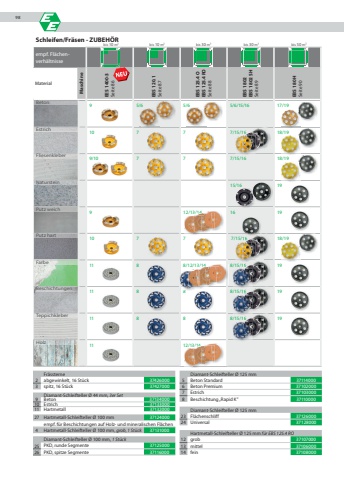 Material Maschine EES 1400-3 Seite 86 EBS 120.1 Seite 87 EBS 125.4 OEBS 125.4 RO Seite 88 EBS 1802 EBS 1802 SH Seite 89 EBS 180 H Seite 90 9 5/6 5/6 5/6/15/16 17/19 10 7 7 7/15/16 18/19 9/10 7 7 7/15/16 18/19 15/16 19 9 12/13/14 16 19 10 7 7 7/15/16 18/19 11 8 8/12/13/14 8/15/16 19 11 8 8 8/15/16 19 11 8 8 8/15/16 19 11 12/13/14 bis 30 m%u00b2 bis 30 m%u00b2 bis 50 m%u00b2Schleifen/Fr%u00e4sen - ZUBEH%u00d6Rempf. Fl%u00e4chenverh%u00e4ltnisseBetonEstrichFliesenkleberNatursteinPutz weichPutz hartFarbeTeppichkleberBeschichtungenHolzFr%u00e4ssterne2 abgewinkelt, 16 St%u00fcck 374260003 spitz, 16 St%u00fcck 37427000Diamant-Schleifteller %u00d8 44 mm, 3er Set9 Beton 3713400010 Estrich 3713300011 Hartmetall 3713200027 Hartmetall-Schleifteller %u00d8 100 mm 37124000empf. f%u00fcr Beschichtungen auf Holz- und mineralischen Fl%u00e4chen4 Hartmetall-Schleifteller %u00d8 100 mm, grob, 1 St%u00fcck 37131000Diamant-Schleifteller %u00d8 100 mm, 1 St%u00fcck25 PKD, runde Segmente 3712500026 PKD, spitze Segmente 37116000Diamant-Schleifteller %u00d8 125 mm5 Beton Standard 371140006 Beton Premium 371020007 Estrich 371030008 Beschichtung %u201eRapid K%u201d 37110000Diamant-Schleifteller %u00d8 125 mm23 Fl%u00e4chenschliff 3712600024 Universal 37128000Hartmetall-Schleifteller %u00d8 125 mm f%u00fcr EBS 125.4 RO12 grob 3710700013 mittel 3710600014 fein 37108000bis 10 m%u00b2 bis 10 m%u00b298812/13/1412/13/148/12/13/147/15/168/15/168/15/168/15/167/15/16