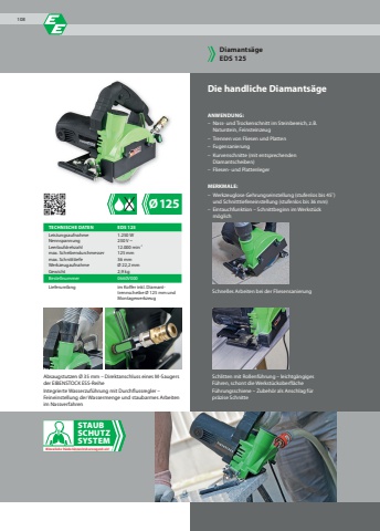 Diamants%u00e4geEDS 125%u00d8125Schlitten mit Rollenf%u00fchrung %u2013 leichtg%u00e4ngiges F%u00fchren, schont die Werkst%u00fcckoberfl%u00e4cheF%u00fchrungsschiene %u2013 Zubeh%u00f6r als Anschlag f%u00fcr pr%u00e4zise SchnitteSchnelles Arbeiten bei der FliesensanierungAbsaugstutzen %u00d8 35 mm %u2013 Direktanschluss eines M-Saugers der EIBENSTOCK ESS-ReiheIntegrierte Wasserzuf%u00fchrung mit Durchflussregler %u2013 Feineinstellung der Wassermenge und staubarmes Arbeiten im NassverfahrenTECHNISCHE DATEN EDS 125Leistungsaufnahme 1.250 WNennspannung 230 V ~Leerlaufdrehzahl 12.000 min-1max. Scheibendurchmesser 125 mmmax. Schnitttiefe 36 mmWerkzeugaufnahme %u00d8 22,2 mmGewicht 2,9 kgBestellnummer 0660V000Lieferumfang im Koffer inkl. Diamanttrennscheibe %u00d8 125 mm und MontagewerkzeugDUSTPROTECTIONSYSTEMMineral dust may cause cancer!STAUBSCHUTZSYSTEMMineralische St%u00e4ube k%u00f6nnen krebserzeugend sein!Die handliche Diamants%u00e4geANWENDUNG:%u2013 Nass- und Trockenschnitt im Steinbereich, z.B. Naturstein, Feinsteinzeug%u2013 Trennen von Fliesen und Platten%u2013 Fugensanierung%u2013 Kurvenschnitte (mit entsprechenden Diamantscheiben)%u2013 Fliesen- und PlattenlegerMERKMALE:%u2013 Werkzeuglose Gehrungseinstellung (stufenlos bis 45%u02da) und Schnitttiefeneinstellung (stufenlos bis 36 mm)%u2013 Eintauchfunktion %u2013 Schnittbeginn im Werkst%u00fcck m%u00f6glich108