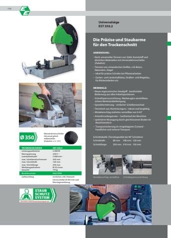 %u00d8350Die Pr%u00e4zise und Staubarmef%u00fcr den Trockenschnitt ANWENDUNG:%u2013 Noch universeller-Trennen von Stahl, Kunststoff und %u00e4hnlichen Materialien mit Universaltrennscheibe (Zubeh%u00f6r)%u2013 Trennen von mineralischen Stoffen, z.B. Beton, Naturstein, Ziegel%u2013 Ideal f%u00fcr pr%u00e4zise Schnitte bei Pflasterarbeiten%u2013 Garten- und Landschaftsbau, Stra%u00dfen- und Wegebau, f%u00fcr Klinkerarbeiten etc.MERKMALE:%u2013 Neuer ergonomischer Handgriff - komfortable Bedienung aus allen Arbeitspositionen%u2013 Schnellspannvorrichtung -Werkzeuglos verstellbare, sichere Werkst%u00fcckbefestigung%u2013 Spindelarretierung %u2013 einfacher Scheibenwechsel%u2013 Trenntisch aus Aluminiumguss - robust und langlebig %u2013 Winkelanschlag stufenlos verstellbar von 0-45%u00b0%u2013 Anlaufstrombegrenzer %u2013 Sanftanlauf der Maschine%u2013 optimierte Absaugung durch geschlossenen Boden im Maschinentisch %u2013 Transportsicherung im eingeklappten Zustand - handlicher und sicherer Transport Schnitttabelle (Trennkapazit%u00e4t bei 90%u00b0 Schnitten)Schnitttiefe: 80 mm 100 mm 120 mmSchnittl%u00e4nge: 250 mm 210 mm 150 mmUniversals%u00e4geEST 350.2Winkelanschlag verstellbar SchnellspannvorrichtungDUSTPROTECTIONSYSTEMMineral dust may cause cancer!STAUBSCHUTZSYSTEMMineralische St%u00e4ube k%u00f6nnen krebserzeugend sein!TECHNISCHE DATEN EST 350.2Leistungsaufnahme 2.400 WNennspannung 230 V ~Leerlaufdrehzahl 3.900 min-1max. Scheibendurchmesser 350 mmmax. Schnitttiefe 120 mmmax. Schnittl%u00e4nge 250 mmWerkzeugaufnahme %u00d8 25,4 mmGewicht 19 kgBestellnummer 06637000Lieferumfang im Karton inkl. Diamanttrennscheibe %u00d8 350 mm und MontagewerkzeugDiamanttrennscheibe Universal gleich mitbestellen(Zubeh%u00f6r s. S. 121)112