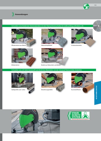 AnwendungenS%u00c4GEN/TRENNEN/SCHLITZENSTAUBSCHUTZSYSTEMMineralische St%u00e4ube k%u00f6nnen krebserzeugend sein!KlinkersteinePfl astersteine aus Beton Natursteinpfl aster SchamottesteineStahlprofi le und -rohre Bewehrungsst%u00e4hle Kunststoff rohreSchneiden von z.B. Stahl, Kunststoff und %u00e4hnlichen Materialien mit der Universal-Trennscheibe (Zubeh%u00f6r):Borde aus Naturstein und BetonSchneiden verschiedenster Steinmaterialien mit der Diamanttrennscheibe (im Lieferumfang enthalten), z.B.:113