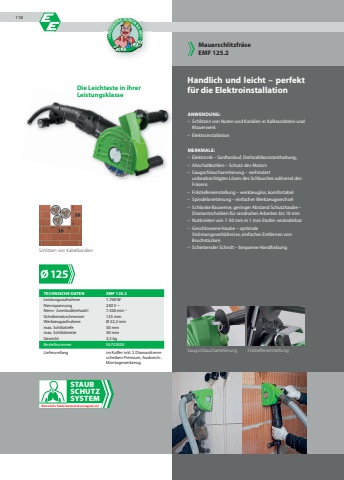 %u00d8125Handlich und leicht %u2013 perfekt f%u00fcr die ElektroinstallationANWENDUNG:%u2013 Schlitzen von Nuten und Kan%u00e4len in Kalksandstein und Mauerwerk%u2013 ElektroinstallationMERKMALE:%u2013 Elektronik %u2013 Sanftanlauf, Drehzahlkonstanthaltung, %u2013 Abschaltkohlen %u2013 Schutz des Motors%u2013 Saugschlaucharretierung %u2013 verhindert unbeabsichtigtes L%u00f6sen des Schlauches w%u00e4hrend des Fr%u00e4sens%u2013 Fr%u00e4stiefeneinstellung %u2013 werkzeuglos, komfortabel%u2013 Spindelarretierung %u2013 einfacher Werkzeugwechsel%u2013 Schlanke Bauweise, geringer Abstand Schutzhaube %u2013 Diamantscheiben f%u00fcr randnahes Arbeiten bis 10 mm%u2013 Nutbreiten von 7-30 mm in 1 mm Stufen ver%u00e4nderbar%u2013 Geschlossene Haube %u2013 optimale Str%u00f6mungsverh%u00e4ltnisse, einfaches Entfernen von Bruchst%u00fccken%u2013 Schiebender Schnitt %u2013 bequeme HandhabungMauerschlitzfr%u00e4seEMF 125.2Schlitzen von Kabelkan%u00e4lenTECHNISCHE DATEN EMF 125.2Leistungsaufnahme 1.700 WNennspannung 230 V ~Nenn- /Leerlaufdrehzahl 7.500 min-1Scheibendurchmesser 125 mmWerkzeugaufnahme %u00d8 22,2 mmmax. Schlitztiefe 30 mmmax. Schlitzbreite 30 mmGewicht 3,5 kgBestellnummer 06703000Lieferumfang im Koffer inkl. 2 Diamanttrennscheiben Premium, Ausbrech-, MontagewerkzeugSaugschlaucharretierung Fr%u00e4stiefeneinstellungSTAUBSCHUTZSYSTEMMineralische St%u00e4ube k%u00f6nnen krebserzeugend sein!Die Leichteste in ihrer Leistungsklasse118