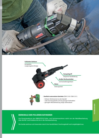 Das Einsatzspektrum der EIBENSTOCK Polier- und Satiniermaschinen reicht von der Metallbearbeitung %u00fcber die Kfz- und Holzbranche bis in die Steinbearbeitung. Die Ger%u00e4te zeichnen sich besonders durch ihre Handlichkeit, Durchzugskraft und Langlebigkeit aus.MERKMALE DER POLIERER/SATINIERER%u2022 Zweifach untersetztes Getriebe (ESM 1310 / ESM 1311) %u2013 h%u00f6heres Drehmoment an der Spindel %u2013 volle Durchzugskraft auch bei geringen Drehzahlen %u2013 geringere Motorbelastung, lange LebensdauerMotorleistungsstarkKompaktgriffbequeme HandhabungGro%u00dfer Ein/Ausschaltermit Feststellm%u00f6glichkeitSchlankes Geh%u00e4usekompaktes,ausgewogenes DesignPOLIEREN/SATINIEREN