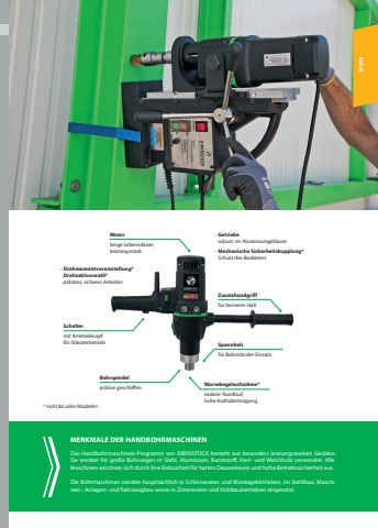 Motorlange Lebensdauer,leistungsstark%u2022 Drehmomentvoreinstellung* Drehzahlvorwahl* pr%u00e4zises, sicheres ArbeitenSchaltermit Arretierknopff%u00fcr St%u00e4nderbetriebBohrspindel pr%u00e4zise geschliffen%u2022 Getriebe robust, im Aluminiumgeh%u00e4use%u2022 Mechanische Sicherheitskupplung*Schutz des BedienersMorsekegelaufnahme*exakter Rundlauf,hohe Kraft%u00fcbertragungSpannhalsf%u00fcr Bohrst%u00e4nder-EinsatzZusatzhandgrifff%u00fcr besseren Halt* nicht bei allen ModellenDas Handbohrmaschinen-Programm von EIBENSTOCK besteht aus besonders leistungsstarken Ger%u00e4ten. Sie werden f%u00fcr gro%u00dfe Bohrungen in Stahl, Aluminium, Kunststoff, Hart- und Weichholz verwendet. Alle Maschinen zeichnen sich durch ihre Robustheit f%u00fcr harten Dauereinsatz und hohe Betriebssicherheit aus.Die Bohrmaschinen werden haupts%u00e4chlich in Schlossereien und Montagebetrieben, im Stahlbau, Maschinen-, Anlagen- und Fahrzeugbau sowie in Zimmereien und Holzbaubetrieben eingesetzt.MERKMALE DER HANDBOHRMASCHINENBOHREN