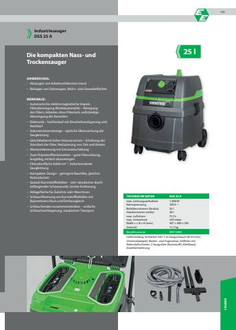 Die kompakten Nass- und TrockensaugerANWENDUNG:%u2013 Absaugen von Arbeitsschl%u00e4mmen (nass)%u2013 Reinigen von Fahrzeugen, Wohn- und Gewerbefl%u00e4chenMERKMALE:%u2013 Automatische, elektromagnetische ImpulsFilterabreinigung (R%u00fcttelautomatik) %u2013 Reinigung des Filters, Arbeiten ohne Filtersack, vollst%u00e4ndige Abreinigung der Kassetten%u2013 Elektronik %u2013 Sanftanlauf mit Einschaltverz%u00f6gerung und Nachlauf%u2013 Volumenstromanzeige %u2013 optische %u00dcberwachung der Saugleistung%u2013 Gleichbleibend hoher Volumenstrom %u2013 Erh%u00f6hung der Standzeit der Filter, Reduzierung von Zeit und Kosten%u2013 Wassererkennung mit Sensorabschaltung%u2013 Zwei Polyesterfilterkassetten %u2013 gute Filterwirkung, langlebig, einfach abzureinigen%u2013 Filteroberfl%u00e4che 8.600 cm2 %u2013 hohe konstante Saugleistung%u2013 Kompaktes Design %u2013 geringere Bauh%u00f6he, gleiches Nutzvolumen%u2013 Spezial-Kunststoffbeh%u00e4lter %u2013 sehr standsicher durch tiefliegenden Schwerpunkt, leichte Entleerung%u2013 Ablagefl%u00e4che f%u00fcr Zubeh%u00f6r oder Maschinen%u2013 Schlauchfixierung am Kunststoffbeh%u00e4lter mit Bajonettverschluss und Drehausgleich%u2013 Schlauchenden zusammensteckbar %u2013 einfache Schlauchverl%u00e4ngerung, staubarmer TransportIndustriesaugerDSS 25 ATECHNISCHE DATEN DSS 25 Amax. Leistungsaufnahme 1.400 WNennspannung 230 V ~Beh%u00e4ltervolumen (brutto) 25 lStaubvolumen (netto) 20 lmax. Luftstrom 73 l/smax. Unterdruck 270 mbarMa%u00dfe L %u00d7 B %u00d7 H (mm) 457 %u00d7 400 %u00d7 535Gewicht 11,7 kgBestellnummer 09915000Lieferumfang: im Karton inkl. 5 m Saugschlauch (%u00d8 35 mm), Universaladapter, Boden- und Fugend%u00fcse, Griffrohr mit Nebenluftschieber, 2 Saugrohre (Kunststoff), Klettband, Zubeh%u00f6rhalterungABSAUGEN25 l131