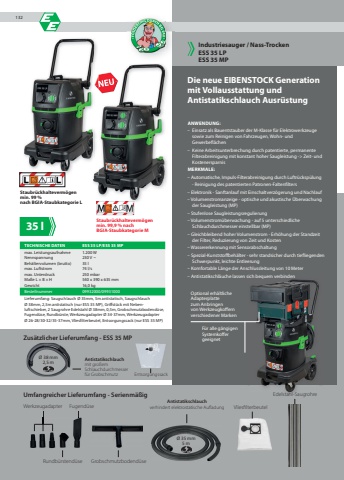 35 l%u00d8 35 mm5 m%u00d8 38 mm2,5 mDie neue EIBENSTOCK Generationmit Vollausstattung und Antistatikschlauch Ausr%u00fcstungANWENDUNG:%u2013 Einsatz als Bauentstauber der M-Klasse f%u00fcr Elektrowerkzeuge sowie zum Reinigen von Fahrzeugen, Wohn- und Gewerbefl%u00e4chen%u2013 Keine Arbeitsunterbrechung durch patentierte, permanente Filterabreinigung mit konstant hoher Saugleistung -> Zeit- und KostenersparnisMERKMALE:%u2013 Automatische, Impuls-Filterabreinigung durch Luftr%u00fccksp%u00fclung - Reinigung des patentierten Patronen-Faltenfilters%u2013 Elektronik - Sanftanlauf mit Einschaltverz%u00f6gerung und Nachlauf%u2013 Volumenstromanzeige - optische und akustische %u00dcberwachung der Saugleistung (MP)%u2013 Stufenlose Saugleistungsregulierung%u2013 Volumenstrom%u00fcberwachung - auf 5 unterschiedliche Schlauchdurchmesser einstellbar (MP)%u2013 Gleichbleibend hoher Volumenstrom - Erh%u00f6hung der Standzeit der Filter, Reduzierung von Zeit und Kosten%u2013 Wassererkennung mit Sensorabschaltung%u2013 Spezial-Kunststoffbeh%u00e4lter - sehr standsicher durch tiefliegenden Schwerpunkt, leichte Entleerung%u2013 Komfortable L%u00e4nge der Anschlussleitung von 10 Meter%u2013 Antistatikschl%u00e4uche lassen sich bequem verbindenIndustriesauger / Nass-TrockenESS 35 LPESS 35 MPTECHNISCHE DATEN ESS 35 LP/ESS 35 MPmax. Leistungsaufnahme 1.200 WNennspannung 230 V ~Beh%u00e4ltervolumen (brutto) 35 lmax. Luftstrom 74 l/smax. Unterdruck 250 mbarMa%u00dfe L %u00d7 B %u00d7 H 540 x 390 x 635 mmGewicht 16,0 kgBestellnummer 09932000/09931000Lieferumfang: Saugschlauch %u00d8 35mm, 5m antistatisch, Saugschlauch %u00d8 38mm, 2,5m antistatisch (nur ESS 35 MP), Griffst%u00fcck mit Nebenluftschieber, 2 Saugrohre Edelstahl %u00d8 38mm, 0,5m, Grobschmutzbodend%u00fcse, Fugend%u00fcse, Rundb%u00fcrste, Werkzeugadapter %u00d8 34-37mm, Werkzeugadapter%u00d8 26-28/30-32/35-37mm, Vliesfilterbeutel, Entsorgungssack (nur ESS 35 MP)Staubr%u00fcckhalteverm%u00f6gen min. 99,9 % nachBGIA-Staubkategorie MStaubr%u00fcckhalteverm%u00f6genmin. 99 % nach BGIA-Staubkategorie LUmfangreicher Lieferumfang - Serienm%u00e4%u00dfigWerkzeugadapterRundb%u00fcrstend%u00fcseFugend%u00fcse Vliesfi lterbeutelGrobschmutzbodend%u00fcseEdelstahl-SaugrohreAntistatikschlauchverhindert elektrostatische Auff adungZus%u00e4tzlicher Lieferumfang - ESS 35 MPEntsorgungssackAntistatikschlauchmit gro%u00dfemSchlauchdurchmesserf%u00fcr GrobschmutzOptional erh%u00e4ltlicheAdapterplattezum Anbringen von Werkzeugkoff ernverschiedener MarkenF%u00fcr alle g%u00e4ngigenSystemkoff ergeeignet132