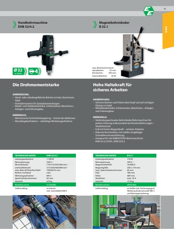 4TECHNISCHE DATEN B 32.1Leistungsaufnahme 110 WNennspannung 230 V ~Magnethaltekraft 16.000 NMagnetgr%u00f6%u00dfe 220 x 110 mmmax. Spannhalsdurchmesser 65 mmHub 180 mmH%u00f6he 409 mmSteckdose max. 16 AGewicht 17,0 kgBestellnummer 09507000Lieferumfang im Koffer inkl. Sicherungsgurt, Weldonaufnahmeschaft MK 3 und MontagewerkzeugHohe Haltekraft f%u00fcrsicheres ArbeitenANWENDUNG:%u2013 Sicheres Bohren und Fr%u00e4sen %u00fcber Kopf und auf schr%u00e4gen Fl%u00e4chen in Stahl%u2013 Metallbaubetriebe, Schlossereien, Maschinen-, Anlagenund FahrzeugbauMERKMALE:%u2013 Verbindungsschraube Bohrst%u00e4nder/Bohrmaschine f%u00fcr pr%u00e4zise F%u00fchrung insbesondere bei Kernlochbohrungen %u2013 Verdrehschutz%u2013 Fu%u00df mit hoher Magnetkraft %u2013 sicheres Arbeiten%u2013 Robuste Konstruktion mit solider, langlebiger Schwalbenschwanzf%u00fchrung%u2013 Geeignet f%u00fcr die EIBENSTOCK-Bohrmaschinen EHB 32/2.2 R R/L, EHB 32/4.2max. Bohrdurchmesser:Spiralbohrer 32 mmKernbohrer 100 mmGewindebohrer M 20Magnetbohrst%u00e4nderB 32.1TECHNISCHE DATEN EHB 32/4.2Leistungsaufnahme 1.700 WNennspannung 230 V ~Nenndrehzahl 110/175/245/385 min-1Leerlaufdrehzahl 215/330/460/680 min-1max. Bohr-%u00d8 Holz/Alu/Stahl 100/60/32 mmRechts-/Linkslauf neinWerkzeugaufnahme MK 3Spannhalsdurchmesser 65 mmGewicht 6,9 kgBestellnummer 0154A000Lieferumfang im Kartoninkl. Austreibkeil MK 3HandbohrmaschineEHB 32/4.2Die DrehmomentstarkeANWENDUNG:%u2013 Hand- oder st%u00e4ndergef%u00fchrtes Bohren in Holz, Aluminium, Stahl%u2013 Antriebsmotoren f%u00fcr Spezialanwendungen%u2013 Metall- und Holzbaubetriebe, Schlossereien, Maschinen-, Anlagen- und FahrzeugbauMERKMALE:%u2013 Mechanische Sicherheitskupplung %u2013 Schutz des Bedieners%u2013 Morsekegelaufnahme %u2013 vielseitige Werkzeugaufnahme%u00d832in StahlBOHREN13