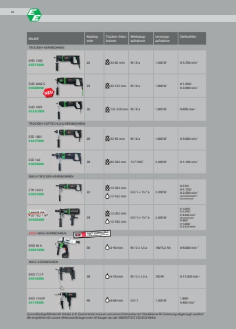 PowerLine100% COMPATIBLEcordless-alliance-system.comGesundheitsgef%u00e4hrdende St%u00e4ube (z.B. Quarzstaub) m%u00fcssen von einem Entstauber mit Staubklasse M-Zulassung abgesaugt werden!Wir empfehlen f%u00fcr unsere Elektrowerkzeuge einen M-Sauger aus der EIBENSTOCK ESS/DSS-Reihe.Modell Katalog,seiteTrocken-/NassbohrenWerkzeugaufnahmeLeistungsaufnahmeDrehzahlenTROCKEN-KERNBOHRENEHD 150003E11000 22 32-82 mm M 18 a 1.500 W 0-3.700 min-1EHD 2002 S03E28000 24 32-132 mm M 18 a 1.800 W 0-1.500/0-3.000 min-1EHD 18010331U000 26 132-250 mm M 18 a 1.800 W 0-800 min-1TROCKEN-SOFTSCHLAG-KERNBOHRENESD 180103217000 28 52-92 mm M 18 a 1.800 W 0-3.000 min-1ESD 16203E25000 30 82-202 mm 1%u00bc\2.200 W 0-1.100 min-1NASS-TROCKEN-KERNBOHRENETN 162/303E31000 3212-202 mm12-162 mmG%u00bd\2.200 W0-510/0-1.150/0-2.500 min-1Leerlaufdrehzahl = NenndrehzahlPLD 182.1 NT0343X000 3412-202 mm12-182 mmG%u00bd\2.300 W0-1.000/0-2.200/0-4.400 min-1Nenndrehzahl:0-480/0-1.080/0-2.350 min-1AKKU-NASS-KERNBOHRENEND 40 A030A1000 36 6-40 mm M 12 x 1,5 a 18V/5,2 Ah 0-8.000 min -1NASS-KERNBOHRENEND 712 P03015000 38 6-18 mm M 12 x 1,5 a 700 W 0-11.000 min-1END 1550 P03114000 40 6-68 mm G%u00bd\1.500 W 1.800-4.400 min-116
