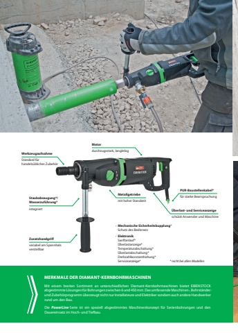 Mit einem breiten Sortiment an unterschiedlichen Diamant-Kernbohrmaschinen bietet EIBENSTOCK abgestimmte L%u00f6sungen f%u00fcr Bohrungen zwischen 6 und 450 mm. Das umfassende Maschinen-, Bohrst%u00e4nderund Zubeh%u00f6rprogramm %u00fcberzeugt nicht nur Installateure und Elektriker sondern auch andere Handwerker rund um den Bau.Die PowerLine-Serie ist ein speziell abgestimmtes Maschinenkonzept f%u00fcr Serienbohrungen und den Dauereinsatz im Hoch- und Tiefbau.MERKMALE DER DIAMANT-KERNBOHRMASCHINENMotordurchzugsstark, langlebig%u2022 Mechanische Sicherheitskupplung* Schutz des Bedieners%u2022 Elektronik Sanftanlauf* %u00dcberlastanzeige* Temperaturabschaltung* %u00dcberlastabschaltung* Drehzahlkonstanthaltung* Serviceanzeige*WerkzeugaufnahmeStandard f%u00fcr handels%u00fcbliches Zubeh%u00f6rStaubabsaugung*/Wasserzuf%u00fchrung*integriertZusatzhandgriffvariabel am Spannhalsverstellbar%u00dcberlast- und Serviceanzeigesch%u00fctzt Anwender und MaschineMetallgetriebemit hoher Standzeit* nicht bei allen ModellenPUR-Baustellenkabel*f%u00fcr starke Beanspruchung