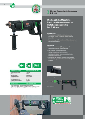 1 %u00d882Die handliche Maschine ideal zum Dosensenken im Installationsgewerbebis %u00d8 82 mmANWENDUNG:%u2013 Trockenbohren bis %u00d8 82 mm in Kalksandstein, Mauerwerk, Klinker, Ziegel und andere abrasive Materialien%u2013 Dosensenken, z.B. f%u00fcr Schalter- und Abzweigdosen bei der ElektroinstallationMERKMALE:%u2013 Elektronik %u2013 Sanftanlauf, Temperatur- und %u00dcberlastabschaltung, %u00dcberlastanzeige%u2013 Mechanische Sicherheitskupplung%u2013 Geringes Gewicht bei hoher Leistung%u2013 PUR-Baustellenkabel %u2013 widerstandsf%u00e4hig f%u00fcr den harten Baustelleneinsatz%u2013 Ergonomischer Handgriff und gro%u00df dimensionierte Schaltertaste %u2013 gute Kontrolle und erm%u00fcdungsarmes ArbeitenDiamant-Trocken-KernbohrmaschineEHD 1500TECHNISCHE DATEN EHD 1500/EHD 1500 SETLeistungsaufnahme 1.500 WNennspannung 230 V ~Nenndrehzahl 0-2.000 min-1Leerlaufdrehzahl 0-3.700 min-1Bohrdurchmesser 32-82 mmWerkzeugaufnahme M 18 aSpannhalsdurchmesser 46 mmGewicht 3,9 kgBestellnummer 03E11000/03E13000Lieferumfang EHD 1500 im Koffer ohne Zubeh%u00f6rLieferumfang EHD 1500 Set im Koffer inkl. Staubabsaugung HB, Dosensenker f%u00fcr Mauerwerk %u00d8 82 mm und Zentrierbohrer%u00dcberlastanzeigeEHD 1500 SetSTAUBSCHUTZSYSTEMMineralische St%u00e4ube k%u00f6nnen krebserzeugend sein!22