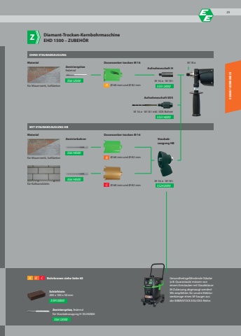 356140003524200035612000355120003561400035514000ABCA B C3591000035612000MIT STAUBABSAUGUNG HBOHNE STAUBABSAUGUNGZentrierbohrerDosensenker trocken M 16Staubabsaugung HBZentrierspitzefederndDosensenker trocken M 16 M 18 aAufnahmeschaft HM 16 a - M 18 if%u00fcr Mauerwerk, Softbetonf%u00fcr Mauerwerk, SoftbetonM 16 a - M 18 iMaterialf%u00fcr KalksandsteinAufnahmeschaft SDSM 16 a - M 18 i inkl. SDS BohrerMaterial%u00d8 68 mm und %u00d8 82 mm%u00d8 68 mm und %u00d8 82 mm%u00d8 68 mm und %u00d8 82 mmGesundheitsgef%u00e4hrdende St%u00e4ube (z.B. Quarzstaub) m%u00fcssen von einem Entstauber mit Staubklasse M-Zulassung abgesaugt werden! Wir empfehlen f%u00fcr unsere Elektrowerkzeuge einen M-Sauger aus der EIBENSTOCK ESS/DSS-Reihe.Bohrkronen siehe Seite 60Diamant-Trocken-Kernbohrmaschine Z EHD 1500 %u2013 ZUBEH%u00d6RSch%u00e4rfstein200 x 100 x 50 mmZentrierspitze, federndf%u00fcr Staubabsaugung H 35240000DIAMANT-KERNBOHREN23