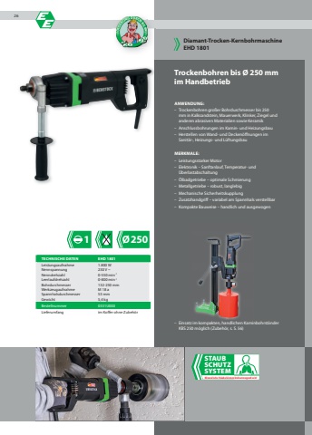 1 %u00d8250Trockenbohren bis %u00d8 250 mmim HandbetriebANWENDUNG:%u2013 Trockenbohren gro%u00dfer Bohrdurchmesser bis 250 mm in Kalksandstein, Mauerwerk, Klinker, Ziegel und anderen abrasiven Materialien sowie Keramik%u2013 Anschlussbohrungen im Kamin- und Heizungsbau%u2013 Herstellen von Wand- und Decken%u00f6ffnungen im Sanit%u00e4r-, Heizungs- und L%u00fcftungsbauMERKMALE:%u2013 Leistungsstarker Motor%u2013 Elektronik %u2013 Sanftanlauf, Temperatur- und %u00dcberlastabschaltung%u2013 %u00d6lbadgetriebe %u2013 optimale Schmierung%u2013 Metallgetriebe %u2013 robust, langlebig%u2013 Mechanische Sicherheitskupplung%u2013 Zusatzhandgriff %u2013 variabel am Spannhals verstellbar%u2013 Kompakte Bauweise %u2013 handlich und ausgewogen%u2013 Einsatz im kompakten, handlichen Kaminbohrst%u00e4nder KBS 250 m%u00f6glich (Zubeh%u00f6r, s. S. 56)Diamant-Trocken-KernbohrmaschineEHD 1801TECHNISCHE DATEN EHD 1801Leistungsaufnahme 1.800 WNennspannung 230 V ~Nenndrehzahl 0-550 min-1Leerlaufdrehzahl 0-800 min-1Bohrdurchmesser 132-250 mmWerkzeugaufnahme M 18 aSpannhalsdurchmesser 53 mmGewicht 5,4 kgBestellnummer 0331U000Lieferumfang im Koffer ohne Zubeh%u00f6rSTAUBSCHUTZSYSTEMMineralische St%u00e4ube k%u00f6nnen krebserzeugend sein!26