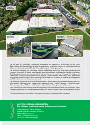 Betriebsteil IIMorgenr%u00f6theELEKTROWERKZEUGE AUS EIBENSTOCK%u00dcber 100 Jahre Qualit%u00e4tswerkzeuge f%u00fcr Industrie und HandwerkElektrowerkzeuge GmbH EibenstockAuersbergstra%u00dfe 10 %u00b7 D-08309 EibenstockTelefon: +49 3 7752 503-0E-Mail: office@eibenstock.comInternet: www.eibenstock.comDas im Jahre 1919 gegr%u00fcndete Unternehmen spezialisierte sich fr%u00fchzeitig auf Profi produkte f%u00fcr den harten Baustelleneinsatz und die Industrie. Mit dieser Strategie konnte in den letzten Jahren ein %u00fcberdurchschnittliches Wachstum erzielt werden. %u00dcber 80 % aller Teile werden in eigener Fertigung produziert.Die Mitarbeiter verweisen mit Stolz darauf, dass der Markenname EIBENSTOCK bei Kunden aus Industrie und Handwerk einen guten Ruf besitzt. Grundlage daf%u00fcr bildet die Verbindung von langj%u00e4hriger Tradition mit aktuellen Entwicklungsergebnissen, ein gut ausgebildeter Facharbeiterstamm, modernste Fertigungstechnologien, ein umfassendes Qualit%u00e4tssicherungssystem und ein kreatives Entwicklungsteam unter Leitung eines dynamischen Managements. Es werden kontinuierlich innovative Produkte entwickelt, die in mehr als 80 L%u00e4nder exportiert werden und f%u00fchrend in bestimmten Produktbereichen sind.Das aktuelle Produktprogramm umfasst Handbohrmaschinen, Diamant-Kernbohrmaschinen, Bohrst%u00e4nder, R%u00fchrwerke, Betonschleifer, Sanierungsfr%u00e4sen, Diamants%u00e4gen, Mauerschlitzfr%u00e4sen, Polierer, Satinierer, Trockenbauschleifer, Bearbeitungsmaschinen f%u00fcr Putze und D%u00e4mmplatten, Spezialelektrowerkzeuge sowie Antriebsmotoren.Dank umfangreicher Investitionen in den Bereichen Motoren- und Getriebefertigung kann das Unternehmen hohen Qualit%u00e4tsanforderungen im internationalen Wettbewerb bei einem g%u00fcnstigen Preis-/Leistungsverh%u00e4ltnis gerecht werden.%u00dcberzeugen auch Sie sich von unseren zuverl%u00e4ssigen Produkten und unserer fachlichen Kompetenz.Schulungs- und EntwicklungszentrumEibenstockBetriebsteil IIIEibenstockHauptsitzEIBENSTOCK
