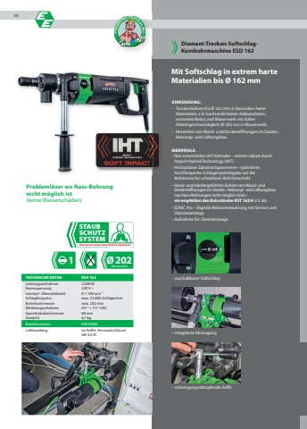 Mit Softschlag in extrem harte Materialien bis %u00d8 162 mmANWENDUNG:%u2013 Trockenbohren bis %u00d8 162 mm in besonders harte Materialien, z.B. hochverdichteten Kalksandstein, armierten Beton und Mauerwerk mit hoher Arbeitsgeschwindigkeit (%u00d8 202 nur in Mauerwerk)%u2013 Herstellen von Wand- und Decken%u00f6ffnungen im Sanit%u00e4r-, Heizungs- und L%u00fcftungsbauMERKMALE:%u2013 Neu entwickeltes IHT-Getriebe %u2013 extrem robust durch Impact-Hybrid-Technology (IHT)%u2013 Hochpr%u00e4zise Zahnkranzgeometrie - optimierte, hochfrequente Schlagimpulsabgabe auf die Bohrkrone f%u00fcr schnelleren Bohrfortschritt%u2013 Hand- und st%u00e4ndergef%u00fchrtes Bohren von Wand- und Decken%u00f6ffnungen im Sanit%u00e4r-, Heizungs- und L%u00fcftungsbau (wo Nass-Bohrungen nicht m%u00f6glich sind) %u2013 wir empfehlen den Bohrst%u00e4nder BST 162 H (s.S. 56)%u2013 EDMC Pro %u2013 Digitale Motorensteuerung mit Service und %u00dcberlastanzeige %u2013 Aufnahme f%u00fcr Zentrierstange%u2013 zuschaltbarer Softschlag%u2013 integrierte Absaugung%u2013 schwingungsd%u00e4mpfende Griffe1 %u00d8202STAUBSCHUTZSYSTEMMineralische St%u00e4ube k%u00f6nnen krebserzeugend sein!TECHNISCHE DATEN ESD 162Leistungsaufnahme 2.200 WNennspannung 230 V ~Leerlauf- /Nenndrehzahl 0-1.100 min-1Schlagfrequenz max. 22.000 Schl%u00e4ge/minBohrdurchmesser max. 202 mmWerkzeugaufnahme G%u00bd\Spannhalsdurchmesser 60 mmGewicht 6,7 kgBestellnummer 03E25000Lieferumfang im Koffer, Einmaulschl%u00fcssel SW 32/41MauerwerkProbleml%u00f6ser wo Nass-Bohrungnicht m%u00f6glich ist(keine Wassersch%u00e4den)Diamant-Trocken-SoftschlagKernbohrmaschine ESD 16230