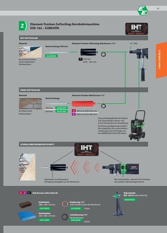 359130000963W000350 mm%u00d8 82 - 162 mmF1%u00bc\36394000200 mm 36395000450 mm 36391000 D 200 mm, %u00d8 82-202 mmE 420 mm, %u00d8 52-202 mmD E F354500003565200035910000OHNE SOFTSCHLAGSCHNELLERER BOHRFORTSCHRITTMIT SOFTSCHLAGDiamant-Trocken-Bohrkronen 1%u00bc\Diamant-Trocken-Softschlag-Bohrkronen 1%u00bc\ZentrierstangeOptimierte, hochfrequente Schlagimpulsabgabe auf die BohrkroneNeu entwickeltes, robustes IHT-Getriebe,sehr pr%u00e4zise ZahnkranzgeometrieMaterialf%u00fcr Mauerwerk,KalksandsteinZentrierstange 350 mmf%u00fcr armierten Beton, hochverdichtetenKalksandsteinMaterialBohrkronen siehe Seite 60Diamant-Trocken-Softschlag-KernbohrmaschineESD 162 %u2013 ZUBEH%u00d6RSch%u00e4rfstein200 x 100 x 50 mmKupferring 1%u00bc\zum leichten L%u00f6sen der Bohrkrone1 St%u00fcckLeichtl%u00f6sering 1%u00bc\f%u00fcr Bohrkronen1 St%u00fcckZGesundheitsgef%u00e4hrdende St%u00e4ube (z.B. Quarzstaub) m%u00fcssen von einem Entstauber mit Staubklasse M-Zulassung abgesaugt werden! Wir empfehlen f%u00fcr unsere Elektrowerkzeuge einen M-Sauger aus der EIBENSTOCK ESS/DSS-Reihe.DIAMANT-KERNBOHRENSch%u00e4rfplatte320 x 320 x 55 mmBohrst%u00e4nderBST 162 H (siehe Seite 56)31