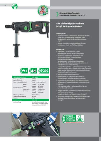 3 %u00d8202Die vielseitige Maschinebis %u00d8 162 mm in BetonANWENDUNG:%u2013 Trockenbohren in Kalksandstein, Mauerwerk, Klinker, Ziegel und andere abrasive Materialien sowie Nassbohren in armierten Beton, Naturstein und Asphalt%u2013 Sanit%u00e4r-, Heizungs- und L%u00fcftungsbau, sonstige Installateure, Hoch- und Tiefbau, GalabauMERKMALE:%u2013 Kraftvoller 2.200 W Motor mit hohen Leistungsreserven und langer Lebensdauer%u2013 Elektronik %u2013 Sanftanlauf, Temperatur- und %u00dcberlastabschaltung, %u00dcberlastanzeige, Drehzahlkonstanthaltung%u2013 Serviceanzeige %u2013 rechtzeitiger Hinweis zum Wechsel der Abschaltkohleb%u00fcrsten (leuchtet ca. 10 Betriebsstunden vor Abschaltung)%u2013 3-Gang %u00d6lbadgetriebe %u2013 optimale Schmierung in allen Arbeitspositionen durch speziell entwickelte %u00d6lpumpe sowie optimal abgestimmtes Drehmoment-DrehzahlVerh%u00e4ltnis f%u00fcr alle Durchmesser%u2013 Mechanische Sicherheitskupplung%u2013 Kombispindel mit integrierter Aufnahme f%u00fcr Zentrierstange %u2013 schnelles, pr%u00e4zises Anbohren%u2013 Ergonomischer Handgriff mit gro%u00df dimensionierter Schaltertaste %u2013 gute Kontrolle und erm%u00fcdungsarmes Arbeiten%u2013 PUR-Baustellenkabel %u2013 widerstandsf%u00e4hig f%u00fcr den harten Baustelleneinsatz%u2013 Adapter Wechsel %u2013 schnelles Umr%u00fcsten zwischen Nassund Trockenanwendung%u2013 Integrierte Libellen auf Maschine und Handgriff%u2013 Schnellaufnahmesystem %u2013 werkzeugloses Befestigen der Maschine im Bohrst%u00e4nder bei montiertem HandgriffDiamant-Nass-TrockenKernbohrmaschine ETN 162/3TECHNISCHE DATEN ETN 162/3Leistungsaufnahme 2.200 WNennspannung 230 V ~Nenn- /Leerlaufdrehzahl 0-520/-1.150/-2.500 min-1 Beton (nass)Bohrdurchmesser Mauerwerk (trocken)1. Gang 72-162 mm2. Gang 42-72 mm3. Gang 12-42 mm1. Gang 112-202 mm2. Gang 62-112 mm3. Gang 12-62 mmWerkzeugaufnahme G%u00bd\Spannhalsdurchmesser 60 mmGewicht 6,7 kgBestellnummer 03E31000Lieferumfang im Koffer, Anschluss f%u00fcr Wasserzufuhr u. Staubabsaugung, Einmaulschl%u00fcssel SW 32/41in MauerwerkSTAUBSCHUTZSYSTEMMineralische St%u00e4ube k%u00f6nnen krebserzeugend sein!32