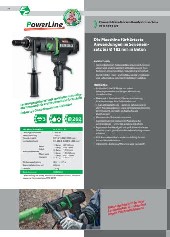 PowerLine3 %u00d8202Die Maschine f%u00fcr h%u00e4rteste Anwendungen im Serieneinsatz bis %u00d8 182 mm in BetonANWENDUNG:%u2013 Trockenbohren in Kalksandstein, Mauerwerk, Klinker, Ziegel und andere abrasive Materialien sowie Nassbohren in armierten Beton, Naturstein und Asphalt%u2013 Bohrbetriebe, Hoch- und Tiefbau, Sanit%u00e4r-, Heizungsund L%u00fcftungsbau, sonstige Installateure, GalabauMERKMALE:%u2013 Kraftvoller 2.300 W Motor mit hohen Leistungsreserven und langer Lebensdauer, dauerbelastbar%u2013 Elektronik %u2013 Sanftanlauf, %u00dcberlastabschaltung, %u00dcberlastanzeige, Abschaltkohleb%u00fcrsten%u2013 3-Gang %u00d6lbadgetriebe %u2013 optimale Schmierung in allen Arbeitspositionen sowie optimal abgestimmtes Drehmoment-Drehzahl-Verh%u00e4ltnis f%u00fcr alle Durchmesser%u2013 Mechanische Sicherheitskupplung%u2013 Kombispindel mit integrierter Aufnahme f%u00fcr Zentrierstange %u2013 schnelles, pr%u00e4zises Anbohren%u2013 Ergonomischer Handgriff mit gro%u00df dimensionierter Schaltertaste %u2013 gute Kontrolle und erm%u00fcdungsarmes Arbeiten%u2013 PUR-Baustellenkabel %u2013 widerstandsf%u00e4hig f%u00fcr den harten Baustelleneinsatz%u2013 Integrierte Libellen auf Maschine und HandgriffDiamant-Nass-Trocken-KernbohrmaschinePLD 182.1 NTK%u00fcrzeste Bauform in ihrer Leistungsklasse %u2013 ideal bei engen Platzverh%u00e4ltnissenTECHNISCHE DATEN PLD 182.1 NTLeistungsaufnahme 2.300 WNennspannung 230 V ~Nenndrehzahl 0-510/-1.200/-2.500 min -1Leerlaufdrehzahl 0-1.000/0-2.200/0-4.400 min-1 Beton (nass)Bohrdurchmesser Mauerwerk (trocken)1. Gang 82-182 mm2. Gang 42-82 mm3. Gang 12-42 mm1. Gang 122-202 mm2. Gang 62-122 mm3. Gang 12-62 mmWerkzeugaufnahme G%u00bd\Spannhalsdurchmesser 60 mmGewicht 7,5 kgBestellnummer 0343X000Lieferumfang: im Koffer, Anschluss f%u00fcr Wasserzufuhr u. Staubabsaugung, Einmaulschl%u00fcssel SW 32/41Leistungsoptimiert mit spezieller Getriebeabstimmung f%u00fcr kraftvollen BohrfortschrittRobustes Ganz-Aluminium-Geh%u00e4usein Mauerwerk34owerLine