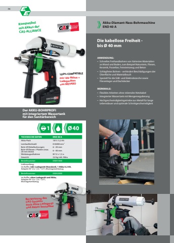 1 %u00d840100% COMPATIBLEmit 18V Akkus +Ladeger%u00e4tenvon METABODie kabellose Freiheit - bis %u00d8 40 mmANWENDUNG:%u2013 Schnelles Freihandbohren von h%u00e4rtesten Materialien  an Wand und Boden, zum Beispiel Naturstein, Fliesen,  Keramik, Porzellan, Feinsteinzeug und Beton%u2013 Schlagfreies Bohren - verhindert Besch%u00e4digungen der  Oberfl%u00e4che und Materialbruch%u2013 Speziell f%u00fcr die SHK- und Elektrobranche sowie  Fliesenleger und DachdeckerMERKMALE:%u2013 Flexibles Arbeiten ohne st%u00f6rendes Netzkabel%u2013 Integrierter Wassertank mit Mengenregulierung%u2013 Hochgeschwindigkeitsgetriebe aus Metall f%u00fcr lange Lebensdauer und optimale SchnittgeschwindigkeitAkku-Diamant-Nass-BohrmaschineEND 40 ADer AKKU-BOHRPROFImit integriertem Wassertankf%u00fcr den Sanit%u00e4rbereichBei Nutzung des CAS-Systemsauch ohne Ladeger%u00e4t und Akkus bestellbarTECHNISCHE DATEN END 40 AAkku-Pack 18 V / 5,2 AhLeerlaufdrehzahl 0-8.000 min-1Bohr-%u00d8 D%u00fcbelbohrungen 6 - 20 mmBohr-%u00d8 Fliesen-/ Platten (max. 20 mm Dicke) 6 - 40 mmWerkzeugaufnahme M 12 %u00d7 1,5 aGewicht 2,4 kg inkl. AkkuBestellnummer 030A1000Lieferumfang:im Koffer, inkl. Ladeger%u00e4t (Standard), 1 Akku 5,2 Ah, Adapter M 12 x 1,5i / 1/2%u201ci, MontagewerkzeugBestellnummer 030A2000im Koffer, ohne Ladeger%u00e4t und Akku, Adapter M 12 x 1,5i / 1/2%u201ci, MontagewerkzeugKompatibelmit Akkus der CAS-ALLIANCE36