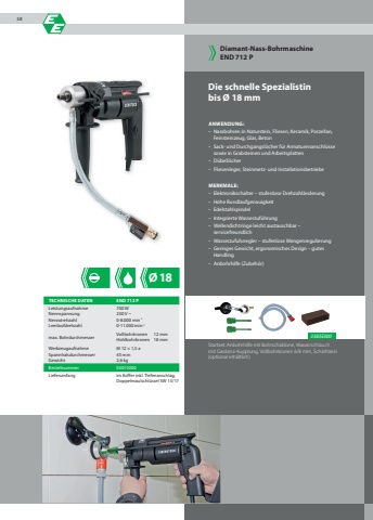 3583E000%u00d818TECHNISCHE DATEN END 712 PLeistungsaufnahme 700 WNennspannung 230 V ~Nenndrehzahl 0-8.000 min-1Leerlaufdrehzahl 0-11.000 min-1max. Bohrdurchmesser Vollbohrkronen 12 mmHohlbohrkronen 18 mmWerkzeugaufnahme M 12 %u00d7 1,5 aSpannhalsdurchmesser 43 mmGewicht 2,6 kg Bestellnummer 03015000Lieferumfang im Koffer inkl. Tiefenanschlag, Doppelmaulschl%u00fcssel SW 13/17Die schnelle Spezialistinbis %u00d8 18 mmANWENDUNG:%u2013 Nassbohren in Naturstein, Fliesen, Keramik, Porzellan, Feinsteinzeug, Glas, Beton%u2013 Sack- und Durchgangsl%u00f6cher f%u00fcr Armaturenanschl%u00fcsse sowie in Grabsteinen und Arbeitsplatten%u2013 D%u00fcbell%u00f6cher%u2013 Fliesenleger, Steinmetz- und InstallationsbetriebeMERKMALE:%u2013 Elektronikschalter %u2013 stufenlose Drehzahl%u00e4nderung%u2013 Hohe Rundlaufgenauigkeit%u2013 Edelstahlspindel%u2013 Integrierte Wasserzuf%u00fchrung%u2013 Wellendichtringe leicht austauschbar %u2013 servicefreundlich%u2013 Wasserzufuhrregler %u2013 stufenlose Mengenregulierung%u2013 Geringes Gewicht, ergonomisches Design %u2013 gutes Handling%u2013 Anbohrhilfe (Zubeh%u00f6r)Startset: Anbohrhilfe mit Bohrschablone, Wasserschlauch mit Gardena-Kupplung, Vollbohrkronen 6/8 mm, Sch%u00e4rfstein(optional erh%u00e4ltlich)Diamant-Nass-BohrmaschineEND 712 P38