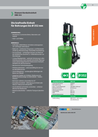 H I J Q3 %u00d8352Die kraftvolle Einheitf%u00fcr Bohrungen bis %u00d8 352 mm ANWENDUNG:%u2013 Nassbohren in armierten Beton, Naturstein und Asphalt%u2013 Hoch- und TiefbauMERKMALE:%u2013 Kraftvoller 3.000 W Motor mit hohen Leistungsreserven und langer Lebensdauer%u2013 Elektronik %u2013 Sanftanlauf, Temperatur- und %u00dcberlastabschaltung, %u00dcberlastanzeige, Drehzahlkonstanthaltung%u2013 Serviceanzeige %u2013 rechtzeitiger Hinweis zum Wechsel der Kohleb%u00fcrsten (leuchtet ca. 10 Betriebsstunden vor Abschaltung)%u2013 3-Gang %u00d6lbadgetriebe %u2013 optimale Schmierung in allen Arbeitspositionen durch speziell entwickelte %u00d6lpumpe sowie optimal abgestimmtes Drehmoment-DrehzahlVerh%u00e4ltnis f%u00fcr alle Durchmesser %u2013 Mechanische Sicherheitskupplung%u2013 PUR-Baustellenkabel %u2013 widerstandsf%u00e4hig f%u00fcr den harten Baustelleneinsatz%u2013 Universalkupplung %u2013 werkzeugloses Befestigen des Motors am St%u00e4nder%u2013 Integrierte Libellen am Schlitten, Skalierung und Bohrlochmittenanzeiger am Bohrst%u00e4nder %u2013 exaktes Arbeiten%u2013 Bohrs%u00e4ule stufenlos schwenkbar bis 45%u00b0%u2013 Kompakter Kombifu%u00df %u2013 Befestigung mit D%u00fcbel oder Vakuum (Vakuumset erforderlich)%u2013 Vorschubhebel rechts/links umsteckbar %u2013 einfacher Wechsel der Bedienseite%u2013 Radachse abnehmbar %u2013 einfacher Transport (abnehmbar)Diamant-KernbohreinheitDBE 352TECHNISCHE DATEN DBE 352Leistungsaufnahme 3.000 WNennspannung 230 V ~Nenn- /Leerlaufdrehzahl 230/500/1.030 min-1Bohrdurchmesser 42-352 mmWerkzeugaufnahme 1%u00bc\S%u00e4ulenl%u00e4nge 995 mmHub 620 mmGewicht Bohreinheit 35,0 kg Bestellnummer 03642000Lieferumfang EBM 352/3 + BST 352 Vohne BohrkroneDIAMANT-KERNBOHRENBohrkronen siehe Seite 60Nass-Bohrkronen51