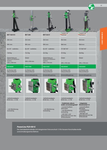 DIAMANT-KERNBOHRENBST 182 V/S BST 250 BST 352 V202 mm 252 mm 352 mm 452 mm 452 mm995 mm 995 mm 995 mm 960 mm 960 mmbis 45%u00b0 - stufenlos bis 45%u00b0 - stufenlos bis 45%u00b0 - stufenlos 75%u00b0/60%u00b0/45%u00b0 75%u00b0/60%u00b0/45%u00b014,0 kg 15,5 kg 22,5 kg 27,0 kg 26,0 kgD%u00fcbel/Vakuum(Vakuumset erforderlich - Zubeh%u00f6r)330 x 250 mmD%u00fcbel430 x 330 mmD%u00fcbel/Vakuum(Vakuumset erforderlich - Zubeh%u00f6r)400 x 310 mmD%u00fcbel295 x 195 mmD%u00fcbel295 x 195 mm09646000 09631000 09647000 0962M000 09656000im Karton inkl. Inbusschl%u00fcsselim Karton inkl. Inbusschl%u00fcsselim Karton inkl. Inbusschl%u00fcsselim Karton inkl. Inbusschl%u00fcsselim Karton inkl. Inbusschl%u00fcsselSchnellaufnahmesystem Universalkupplung Universalkupplung Universalkupplung Universalkupplung-Aufnahmeadapter %u00d8 60 mm, s. S. 58-Aufnahmeadapter %u00d8 60 mm, s. S. 58-Aufnahmeadapter %u00d8 60 mm, s. S. 58-Aufnahmeadapter %u00d8 60 mm, s. S. 58-Aufnahmeadapter %u00d8 60 mm, s. S. 58%u2013 mit Abst%u00fctzung r%u00fcckw%u00e4rtig%u2013 mit Abst%u00fctzung r%u00fcckw%u00e4rtig%u2013 Stahls%u00e4ule robust, stabil, verwindungssteif%u2013 auswechselbare Zahns%u00e4ule%u2013 mit Abst%u00fctzung r%u00fcckw%u00e4rtig%u2013 alle Stell- und Spannelement mit 19er Schl%u00fcsselweite%u2013integrierter Feinvorschub 1:3%u2013 auswechselbareZahns%u00e4ule%u2013 mit Abst%u00fctzung r%u00fcckw%u00e4rtig%u2013 alle Stell- und Spannelement mit 19er Schl%u00fcsselweitePowerLine PLB 450 GDer Getriebebohrst%u00e4nder mit integriertem Feinvorschub 1:3 f%u00fcr bessere Vorschubkontrolle und erm%u00fcdungsarmes BohrenPowerLinePLB 450PowerLinePLB 450 G57