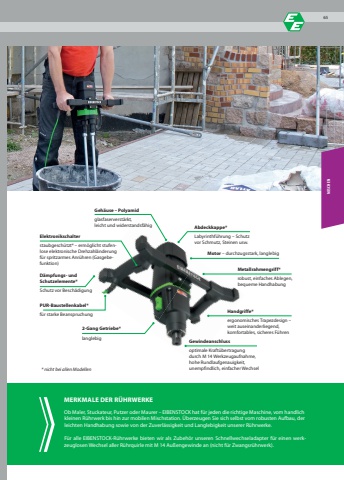 Handgriffe*ergonomisches Trapezdesign %u2013 weit auseinanderliegend,komfortables, sicheres F%u00fchrenGeh%u00e4use %u2013 Polyamidglasfaserverst%u00e4rkt, leicht und widerstandsf%u00e4higMotor %u2013 durchzugsstark, langlebig2-Gang Getriebe*langlebig Gewindeanschlussoptimale Kraft%u00fcbertragungdurch M 14 Werkzeugaufnahme,hohe Rundlaufgenauigkeit,unempfindlich, einfacher WechselD%u00e4mpfungs- undSchutzelemente*Schutz vor Besch%u00e4digungMetallrahmengriff*robust, einfaches Ablegen,bequeme HandhabungAbdeckkappe*Labyrinthf%u00fchrung %u2013 Schutzvor Schmutz, Steinen usw.Elektronikschalterstaubgesch%u00fctzt* %u2013 erm%u00f6glicht stufenlose elektronische Drehzahl%u00e4nderung f%u00fcr spritzarmes Anr%u00fchren (Gasgebefunktion)PUR-Baustellenkabel*f%u00fcr starke BeanspruchungOb Maler, Stuckateur, Putzer oder Maurer %u2013 EIBENSTOCK hat f%u00fcr jeden die richtige Maschine, vom handlich kleinen R%u00fchrwerk bis hin zur mobilen Mischstation. %u00dcberzeugen Sie sich selbst vom robusten Aufbau, der leichten Handhabung sowie von der Zuverl%u00e4ssigkeit und Langlebigkeit unserer R%u00fchrwerke.F%u00fcr alle EIBENSTOCK-R%u00fchrwerke bieten wir als Zubeh%u00f6r unseren Schnellwechseladapter f%u00fcr einen werkzeuglosen Wechsel aller R%u00fchrquirle mit M 14 Au%u00dfengewinde an (nicht f%u00fcr Zwangsr%u00fchrwerk).MERKMALE DER R%u00dcHRWERKE* nicht bei allen ModellenMISCHEN65