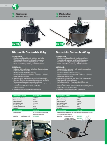 50 kg 80 kgDie mobile Station bis 80 kgANWENDUNG:%u2013 Mischen von Baustoffen mit mittlerer und hoher Viskosit%u00e4t, z.B. Spachtel- und Ausgleichsmassen, Fliesenkleber, Fertigm%u00f6rtel, Fertigputz, Estrich%u2013 Hoch- und Tiefbau, Galabau, Fu%u00dfbodensaniererMERKMALE:%u2013 Robuster Universalmotor %u2013 sehr hohe Durchzugskraft%u2013 Schalter mit Staubschutz%u2013 Mechanische Sicherheitskupplung%u2013 Integriertes Transportgestell mit Zugstange %u2013 mobiler Einsatz der Mischstation%u2013 Werkzeugloses Trennen von Motor und Untergestell%u2013 Platzsparende Aufbewahrung%u2013 Sicherheitsschalter %u2013 Abschalten bei %u00d6ffnen des Schutzgitters, Schutz des Bedieners%u2013 Nachmischfunktion %u2013 Spezialschalter f%u00fcr nachtr%u00e4gliches Eintauchen und Nachmischen%u2013 Verdrehschutz f%u00fcr Mischk%u00fcbel %u2013 standsicherDie mobile Station bis 50 kgANWENDUNG:%u2013 Mischen von Baustoffen mit mittlerer und hoher Viskosit%u00e4t, z.B. Spachtel- und Ausgleichsmassen, Fliesenkleber, Fertigm%u00f6rtel, Fertigputz, Estrich%u2013 Hoch- und Tiefbau, Galabau, Fu%u00dfbodensaniererMERKMALE:%u2013 Robuster Universalmotor %u2013 sehr hohe Durchzugskraft%u2013 Schalter mit Staubschutz%u2013 Mechanische Sicherheitskupplung%u2013 Integriertes Transportgestell mit Zugstange %u2013 mobiler Einsatz der Mischstation%u2013 Werkzeugloses Trennen von Motor und Untergestell%u2013 Geringes Gewicht, kompakte Abmessungen %u2013 einfacher Transport und platzsparende Aufbewahrung%u2013 Schutzgitter %u2013 einfaches, sicheres Entleeren von Sackware%u2013 Ausklappbarer Maschinenarm %u2013 einfacher Beh%u00e4lterwechsel%u2013 Verdrehschutz f%u00fcr Mischk%u00fcbel %u2013 standsicherTECHNISCHE DATEN AUTOMIX 1801Leistungsaufnahme 1.500 WNennspannung 230 V ~Nenndrehzahl 50 min-1Leerlaufdrehzahl 115 min-1Beh%u00e4ltergr%u00f6%u00dfe 65 lWerkzeugaufnahme M 20 iGewicht 26,5 kgBestellnummer 07614000Lieferumfang im Karton inkl. R%u00fchrpaddel und Mischk%u00fcbel 65 lZubeh%u00f6r Mischk%u00fcbel 65 l 32341000MischstationAutomix 1801MischstationAutomix 90TECHNISCHE DATEN AUTOMIX 90Leistungsaufnahme 1.500 WNennspannung 230 V ~Nenndrehzahl 50 min-1Leerlaufdrehzahl 115 min-1Beh%u00e4ltergr%u00f6%u00dfe 90 lWerkzeugaufnahme M 20 iGewicht 35,0 kgBestellnummer 07617000Lieferumfang: Im Karton inkl. Spezialr%u00fchrquirl und Mischk%u00fcbel 90 l und TransportwagenZubeh%u00f6r Mischk%u00fcbel 90 l 32342000 Transportwagen 32331000(ohne Mischk%u00fcbel)78
