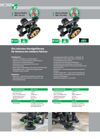 %u00d8125 %u00d8125TECHNISCHE DATEN EBS 125.4 OLeistungsaufnahme 1.500 WNennspannung 230 V ~Nenn- /Leerlaufdrehzahl 10.000 min-1Scheibendurchmesser 125 mmWerkzeugaufnahme %u00d8 22,2 mmGewicht 4,5 kgBestellnummer 06324000Lieferumfang im Koffer inkl. DiamantSchleifteller (Beton) und MontagewerkzeugTECHNISCHE DATEN EBS 125.4 ROLeistungsaufnahme 1.500 WNennspannung 230 V ~Nenn- /Leerlaufdrehzahl 6.000-10.000 min-1Scheibendurchmesser 125 mmWerkzeugaufnahme %u00d8 22,2 mmGewicht 4,5 kgBestellnummer 06325000Lieferumfang im Koffer inkl. DiamantSchleifteller (Beton) und MontagewerkzeugANWENDUNG:%u2013 Schleifen und Gl%u00e4tten von Unebenheiten%u2013 Entfernen von Schalungsn%u00e4hten, Schl%u00e4mmh%u00e4uten, Altanstrichen und Beschichtungen%u2013 Vorbereiten von Untergr%u00fcnden, z.B. bei der Fliesenerneuerung%u2013 Beton, Estrich, Fliesenkleber, Putz, Farbe, Beschichtungen, Teppichkleber, Holz %u2013 entsprechend abgestimmte Schleifteller siehe Zubeh%u00f6r MERKMALE:%u2013 Elektronik %u2013 Sanftanlauf, Drehzahlkonstanthaltung, Drehzahlabsenkung bei %u00dcberlast, Temperatur- und %u00dcberlastabschaltungBetonschleiferEBS 125.4 OBetonschleiferEBS 125.4 RODie robusten Handgef%u00fchrtenf%u00fcr kleinere bis mittlere Fl%u00e4chen%u2013 Drehzahlregelung (EBS 125.4 RO) %u2013 erm%u00f6glicht die Bearbeitung von Gips, Kalksandstein und Holz mit hartmetallbestreuten Scheiben%u2013 Vorderteil der Schutzhaube hochklappbar %u2013 Schleifarbeiten bis unmittelbar an die Kante der Bearbeitungsfl%u00e4che (keine m%u00fchevolle Nacharbeit, spart Zeit und Kosten)%u2013 B%u00fcrstenkranz %u2013 hohe Absaugleistung f%u00fcr staubarmes Arbeiten %u2013 Parallele Griffposition %u2013 ergonomische Handhabung erlaubt genaues und ausbalanciertes F%u00fchren f%u00fcr ein besseres Schleifergebnis%u2013 Bodenf%u00fchrungsgestell %u2013 nachr%u00fcstbarDrehzahlregelung88Betonschleifer