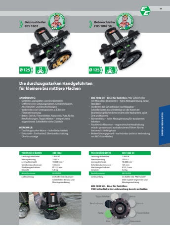 %u00d8125 %u00d8125TECHNISCHE DATEN EBS 1802 SHLeistungsaufnahme 1.800 WNennspannung 230 V ~Leerlaufdrehzahl 10.000 min-1Scheibendurchmesser 125 mmWerkzeugaufnahme %u00d8 22,2 mmGewicht 5,6 kgBestellnummer 0633L000Lieferumfang im Koffer inkl. PKD-Schleifteller (spitze Segmente) und MontagewerkzeugTECHNISCHE DATEN EBS 1802Leistungsaufnahme 1.800 WNennspannung 230 V ~Leerlaufdrehzahl 10.000 min-1Scheibendurchmesser 125 mmWerkzeugaufnahme %u00d8 22,2 mmGewicht 5,6 kgBestellnummer 0633J000Lieferumfang im Koffer inkl. DiamantSchleifteller (Beton) und MontagewerkzeugANWENDUNG:%u2013 Schleifen und Gl%u00e4tten von Unebenheiten%u2013 Entfernen von Schalungsn%u00e4hten, Schl%u00e4mmh%u00e4uten, Altanstrichen und Beschichtungen%u2013 Vorbereiten von Untergr%u00fcnden, z.B. bei der Fliesenerneuerung%u2013 Beton, Estrich, Fliesenkleber, Naturstein, Putz, Farbe, Beschichtungen, Teppichkleber %u2013 entsprechend abgestimmte Schleifteller siehe Zubeh%u00f6rMERKMALE:%u2013 Durchzugsstarker Motor %u2013 hohe Belastbarkeit%u2013 Elektronik %u2013 Sanftanlauf, %u00dcberlastabschaltung, %u00dcberlastanzeige%u2013 EBS 1802 SH %u2013 Einer f%u00fcr fast Alles: PKD-Schleifteller mit Monobloc-Diamanten %u2013 hohe Abtragsleistung, lange Standzeit%u2013 Vorderteil der Schutzhaube hochklappbar %u2013 Schleifarbeiten bis unmittelbar an die Kante der Bearbeitungsfl%u00e4che (keine m%u00fchevolle Nacharbeit, spart Zeit und Kosten)%u2013 B%u00fcrstenkranz %u2013 hohe Absaugleistung f%u00fcr staubarmes Arbeiten %u2013 Parallele Griffposition %u2013 ergonomische Handhabung erlaubt genaues und ausbalanciertes F%u00fchren f%u00fcr ein besseres Schleifergebnis%u2013 Bodenf%u00fchrungsgestell %u2013 nachr%u00fcstbar (nicht in Verbindung mit PKD-Schleifteller)BetonschleiferEBS 1802 SHBetonschleiferEBS 1802Die durchzugsstarken Handgef%u00fchrtenf%u00fcr kleinere bis mittlere Fl%u00e4chenBetonEstrichFliesenkleberNatursteinTeppichkleberBeschichtungFarbePutzEBS 1802 SH %u2013 Einer f%u00fcr fast Alles:PKD-Schleifteller im Lieferumfang bereits enthaltenSCHLEIFEN/FR%u00c4SEN/GL%u00c4TTEN89Betonschleifer Betonschleifer