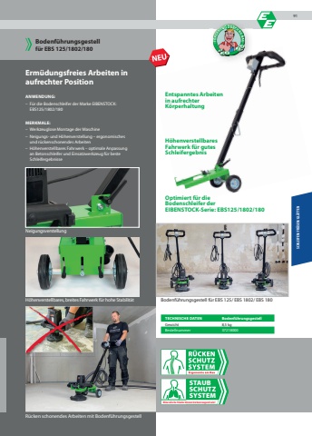Entspanntes Arbeiten in aufrechter K%u00f6rperhaltungH%u00f6henverstellbaresFahrwerk f%u00fcr gutesSchleifergebnisOptimiert f%u00fcr dieBodenschleifer derEIBENSTOCK-Serie: EBS125/1802/180TECHNISCHE DATEN Bodenf%u00fchrungsgestellGewicht 8,5 kgBestellnummer 37218000Erm%u00fcdungsfreies Arbeiten in aufrechter PositionANWENDUNG:%u2013 F%u00fcr die Bodenschleifer der Marke EIBENSTOCK: EBS125/1802/180MERKMALE:%u2013 Werkzeuglose Montage der Maschine%u2013 Neigungs- und H%u00f6henverstellung %u2013 ergonomisches und r%u00fcckenschonendes Arbeiten%u2013 H%u00f6henverstellbares Fahrwerk %u2013 optimale Anpassung an Betonschleifer und Einsatzwerkzeug f%u00fcr beste SchleifergebnisseBodenf%u00fchrungsgestellf%u00fcr EBS 125/1802/180R%u00fccken schonendes Arbeiten mit Bodenf%u00fchrungsgestellBodenf%u00fchrungsgestell f%u00fcr EBS 125/ EBS 1802/ EBS 180SCHLEIFEN/FR%u00c4SEN/GL%u00c4TTENNeigungsverstellungH%u00f6henverstellbares, breites Fahrwerk f%u00fcr hohe Stabilit%u00e4t STAUBSCHUTZSYSTEMMineralische St%u00e4ube k%u00f6nnen krebserzeugend sein!91