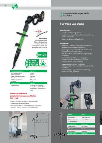 %u00d8125clickLanghals-SanierungsschleiferELS 125 DF%u00fcr Wand und DeckeANWENDUNG:%u2013 Schleifen von Schalungsn%u00e4hten%u2013 Entfernen von Graten, Unebenheiten, Anstrichen und d%u00fcnnen Kleberesten%u2013 Gl%u00e4tten von Beton- und Putzfl%u00e4chenMERKMALE:%u2013 Elektronik %u2013 Sanftanlauf, Drehzahlkonstanthaltung, Temperatur- und %u00dcberlastabschaltung%u2013 Werkzeuglos austauschbare flexible Antriebswelle %u2013 kurze Bauform, servicefreundlich%u2013 Robustes Gelenk %u2013 optimale Anpassung an Neigung und Winkel%u2013 Vorderteil der Schutzhaube hochklappbar %u2013 Schleifarbeiten bis unmittelbar an die Kante%u2013 Absaugstutzen %u00d8 35 mm (drehbar)%u2013 Saugschlaucharretierung %u2013 verhindert unbeabsichtigtes L%u00f6sen des Schlauches w%u00e4hrend des Schleifens%u2013 Zusatzhandgriff %u2013 ergonomische Handhabung, variabel am Ger%u00e4t verstellbarDATEN EFWArbeitsh%u00f6he max. 2600 mmArbeitsh%u00f6he mit1x Verl%u00e4ngerungmax. 2900 mmBestellnummer 3765A000Lieferumfang im KartonZubeh%u00f6r Verl%u00e4ngerungArbeitsh%u00f6he 300 mmBestellnummer 3765B0002900 mm+ 300 mm Verl%u00e4ngerung (Zubeh%u00f6r)Antriebswelleim Servicefall ohne %u00d6ffnen der Maschine einfach, schnell und kosteng%u00fcnstig durch den Anwender austauschbarSTAUBSCHUTZSYSTEMMineralische St%u00e4ube k%u00f6nnen krebserzeugend sein!Fahrwagen EFW f%u00fcr Langhals-SanierungsschleiferELS 125 D%u2022 Mobiler Fahrwagen f%u00fcr Maschine und Staubsauger%u2022 Kraftersparnis bei Deckenarbeiten%u2022 Werkzeugloser Aufbau - einfacher Transport, gummierte Lenkr%u00e4der - leichtes Bewegen, ein Rad feststellbarTECHNISCHE DATEN ELS 125 DLeistungsaufnahme 1.200 WNennspannung 230 V ~Nenn- /Leerlaufdrehzahl 8.000 min-1Scheibendurchmesser 125 mmWerkzeugaufnahme %u00d8 22,2 mmGewicht 5,3 kgBestellnummer 06231000Lieferumfang im Karton inkl. Transporttasche, Diamant-Schleifteller Universal und Montagewerkzeug96