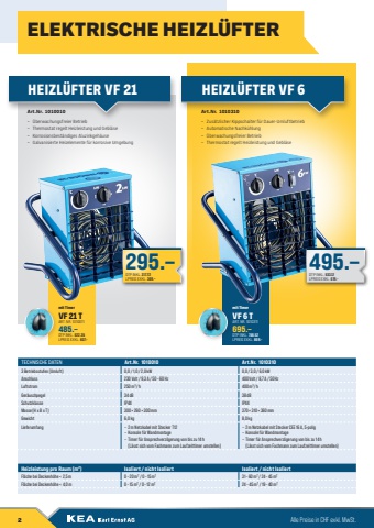 mit Timer VF 6 TART. NR. 1010311 695.%u2013DTP INKL. 748.52LPREIS EXKL. 869.-mit Timer VF 21 TART. NR. 1010011 485.%u2013DTP INKL. 522.35LPREIS EXKL. 607.-HEIZL%u00dcFTER VF 21 HEIZL%u00dcFTER VF 6Art.Nr. 1010010%u2013 %u00dcberwachungsfreier Betrieb%u2013 Thermostat regelt Heizleistung und Gebl%u00e4se%u2013 Korrosionsbest%u00e4ndiges Aluzinkgeh%u00e4use%u2013 Galvanisierte Heizelemente f%u00fcr korrosive UmgebungArt.Nr. 1010310%u2013 Zus%u00e4tzlicher Kippschalter f%u00fcr Dauer-Umluftbetrieb%u2013 Automatische Nachk%u00fchlung%u2013 %u00dcberwachungsfreier Betrieb%u2013 Thermostat regelt Heizleistung und Gebl%u00e4seTECHNISCHE DATEN Art.Nr. 1010010 Art.Nr. 10103103 Betriebsstufen (Umluft) 0,0 /1,0 /2,0 kW 0,0 /3,0 /6,0 kWAnschluss 230 Volt/9,3 A /50 %u201360 Hz 400 Volt/8,7 A /50 HzLuftstrom 250m3/h 400m3/hGer%u00e4uschpegel 34dB 38dBSchutzklasse IP44 IP44Masse (H x B x T) 300 %u00d7 260 %u00d7 300mm 370 %u00d7 310 %u00d7 360mmGewicht 6,0 kg 8,0 kgLieferumfang %u2013 2m Netzkabel mit Stecker T12%u2013 Konsole f%u00fcr Wandmontage%u2013 Timer f%u00fcr%u00a0Ansprechverz%u00f6gerung von bis zu 14h(L%u00e4sst sich vom Fachmann zum Laufzeittimer umstellen)%u2013 2m Netzkabel mit Stecker CEE 16 A, 5-polig%u2013 Konsole f%u00fcr Wandmontage%u2013 Timer f%u00fcr%u00a0Ansprechverz%u00f6gerung von bis zu 14h(L%u00e4sst sich vom Fachmann zum Laufzeittimer umstellen)Heizleistung pro Raum (m2) Isoliert / nicht Isoliert Isoliert / nicht IsoliertFl%u00e4che bei Deckenh%u00f6he < 2,5m 0 %u201320m2/ 0 %u201315m2 31%u201360m2/24%u201345m2Fl%u00e4che bei Deckenh%u00f6he < 4,0m 0 %u201315m2/ 0 %u201312m2 24%u201345m2/19%u201340m2ELEKTRISCHE HEIZL%u00dcFTER295.%u2013DTP INKL. 317.72LPREIS EXKL. 369.%u2013495.%u2013DTP INKL. 533.12LPREIS EXKL. 619.-2 Alle Preise in CHF exkl. MwSt.