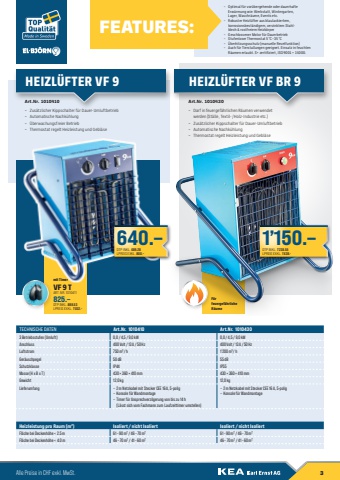 mit Timer VF 9 TART. NR. 1010411 825.%u2013DTP INKL. 888.53LPREIS EXKL. 1%u2019032.-F%u00fcr feuergef%u00e4hrliche R%u00e4umeHEIZL%u00dcFTER VF 9Art.Nr. 1010410%u2013 Zus%u00e4tzlicher Kippschalter f%u00fcr Dauer-Umluftbetrieb%u2013 Automatische Nachk%u00fchlung%u2013 %u00dcberwachungsfreier Betrieb%u2013 Thermostat regelt Heizleistung und Gebl%u00e4seHEIZL%u00dcFTER VF BR 9Art.Nr. 1010430%u2013 Darf in feuergef%u00e4hrlichen R%u00e4umen verwendetwerden (St%u00e4lle, Textil-/ Holz-Industrie etc.)%u2013 Zus%u00e4tzlicher Kippschalter f%u00fcr Dauer-Umluftbetrieb%u2013 Automatische Nachk%u00fchlung%u2013 Thermostat regelt Heizleistung und Gebl%u00e4se%u2013 Optimal f%u00fcr vor%u00fcbergehende oder dauerhafte Erw%u00e4rmung wie: Werkstatt, Wintergarten, Lager, Waschr%u00e4ume, Events etc.%u2013 Robuster Heizl%u00fcfter aus blaulackiertem, korrosionsbest%u00e4ndigem, verzinktem Stahlblech & rostfreiem Heizk%u00f6rper%u2013 Geschlossener Motor f%u00fcr Dauerbetrieb%u2013 Stufenloser Thermostat 5 %u00b0C%u201335 %u00b0C%u2013 %u00dcberhitzungsschutz (manuelle Resetfunktion)%u2013 Auch f%u00fcr Tierstallungen geeignet. Einsatz in feuchten R%u00e4umen erlaubt. S+ zertifiziert, ISO9001 + 14000.TECHNISCHE DATEN Art.Nr. 1010410 Art.Nr. 10104303 Betriebsstufen (Umluft) 0,0 /4,5/9,0 kW 0,0 /4,5/9,0 kWAnschluss 400 Volt/13 A /50 Hz 400 Volt/13 A /50 HzLuftstrom 750m3/h 1%u2019200m3/hGer%u00e4uschpegel 50 dB 55dBSchutzklasse IP44 IP55Masse (H x B x T) 430 %u00d7 360 %u00d7 410mm 430 %u00d7 360 %u00d7 410mmGewicht 12,0 kg 12,0 kgLieferumfang %u2013 2m Netzkabel mit Stecker CEE 16 A, 5-polig%u2013 Konsole f%u00fcr Wandmontage%u2013 Timer f%u00fcr%u00a0Ansprechverz%u00f6gerung von bis zu 14h(L%u00e4sst sich vom Fachmann zum Laufzeittimer umstellen)%u2013 2m Netzkabel mit Stecker CEE 16 A, 5-polig%u2013 Konsole f%u00fcr WandmontageHeizleistung pro Raum (m2) Isoliert / nicht Isoliert Isoliert / nicht IsoliertFl%u00e4che bei Deckenh%u00f6he < 2.5m 61%u201390m2/46%u201370m2 61%u201390m2/46%u201370m2Fl%u00e4che bei Deckenh%u00f6he < 4.0m 46%u201370m2/41%u201360m2 46%u201370m2/41%u201360m2FEATURES:640.%u2013DTP INKL. 689.28LPREIS EXKL. 800.%u20131%u2019150.%u2013DTP INKL. 1%u2019238.55LPREIS EXKL. 1%u2019438.-Alle Preise in CHF exkl. MwSt. 3