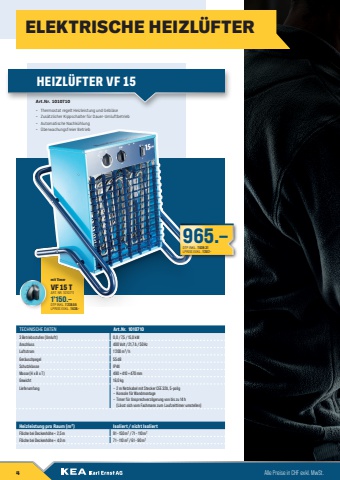 mit Timer VF 15 TART. NR. 1010711 1%u2019150.%u2013DTP INKL. 1%u2019238.55LPREIS EXKL. 1%u2019438.-HEIZL%u00dcFTER VF 15Art.Nr. 1010710%u2013 Thermostat regelt Heizleistung und Gebl%u00e4se%u2013 Zus%u00e4tzlicher Kippschalter f%u00fcr Dauer-Umluftbetrieb%u2013 Automatische Nachk%u00fchlung%u2013 %u00dcberwachungsfreier BetriebELEKTRISCHE HEIZL%u00dcFTERTECHNISCHE DATEN Art.Nr. 10107103 Betriebsstufen (Umluft) 0,0 /7,5/15,0 kWAnschluss 400 Volt/21,7 A /50 HzLuftstrom 1%u2019200m3/hGer%u00e4uschpegel 55dBSchutzklasse IP44Masse (H x B x T) 490 %u00d7 410 %u00d7 470mmGewicht 16,0 kgLieferumfang %u2013 2 m Netzkabel mit Stecker CEE 32A, 5-polig%u2013 Konsole f%u00fcr Wandmontage%u2013 Timer f%u00fcr%u00a0Ansprechverz%u00f6gerung von bis zu 14h(L%u00e4sst sich vom Fachmann zum Laufzeittimer umstellen)Heizleistung pro Raum (m2) Isoliert / nicht IsoliertFl%u00e4che bei Deckenh%u00f6he < 2,5m 91%u2013150m2/71%u2013110m2Fl%u00e4che bei Deckenh%u00f6he < 4,0m 71%u2013110m2/61%u201390m2965.%u2013DTP INKL. 1%u2019039.31LPREIS EXKL. 1%u2019207.-4 Alle Preise in CHF exkl. MwSt.