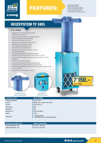 Art.Nr. 1010810%u2013 Integriertes Textil-Luftverteilersystem 360%u00b0 f%u00fcr optimale Luftverteilung%u2013 Integrierter %u00dcberhitzungsschutz mit automatischem Reset nach Abk%u00fchlung der Heizelemente %u2013 Stufenloses Thermostat von 5%u201335 %u00b0C%u2013 Radiall%u00fcfter f%u00fcr optimale Luftumw%u00e4lzung und Wurfweite sowie konstanter Luftdruck%u2013 Alle Schaltelemente seitlich montiert. Keine Erhitzung der Schaltelemente! %u2013 Heizelement konstruiert f%u00fcr optimalen Luftstrom und schnelles Aufheizen %u2013 Komfortables Transportieren dank robusten Rollen %u2013 Kann auch mit einem Anschluss betrieben werden, max. 9 kW%u2013 F%u00fcr dauerndes oder tempor%u00e4res Beheizen von grossen R%u00e4umen, Hallen, Baustellen %u2013 Einsatz in nassen R%u00e4umen m%u00f6glich%u2013 F%u00fcr professionelle sowie private Anwendung geeignet (Zivilschutzraum, Partyzelt, Treppenhaus, Wohnung etc.)%u2013 Automatische Nachk%u00fchlung (muss am Strom angeschlossen bleiben bis der L%u00fcfter ausschaltet)%u2013 Gesamth%u00f6he mit Textilverteiler: 2%u2019150 mmHandgriff mitSchutzisolierungTextilverteiler mitsechs Luftausg%u00e4ngenHEIZSYSTEM TF 18EL%u2013 %u00dcber 10 Jahre Ersatzteilverf%u00fcgbarkeit garantiert. %u2013 Service- und reparaturfreundlich. %u2013 Stark in der Produktentwicklung %u2013 besonders guter Vorsprung bei Nachhaltigkeit und EnergieeinsparungFEATURES:TECHNISCHE DATEN Art.Nr. 10108103 Betriebsstufen (Umluft) 4,5/9,0 /18kWAnschluss 400 Volt/16 A, 2 %u00d7 400 Volt/16 A %u2013CEE 16 ALuftstrom 2%u2019300 /1%u2019700m3/hGer%u00e4uschpegel 65dBSchutzklasse IP44Masse (H x B x T) 1%u2019260 %u00d7 530 %u00d7 660mmGewicht 72,0 kgLieferumfang %u2013 Ohne Kabel geliefert%u2013 Textilverteiler mit sechs Luftausg%u00e4ngen %u00d8 95mmHeizleistung pro Raum (m2) Isoliert / nicht IsoliertFl%u00e4che bei Deckenh%u00f6he < 2,5m 182%u2013270m2/138%u2013210m2Fl%u00e4che bei Deckenh%u00f6he < 4,0m 138%u2013210m2/123%u2013180m27%u2019150.%u2013DTP INKL. 7%u2019700.55LPREIS EXKL. 8%u2019938.-Alle Preise in CHF exkl. MwSt. 7