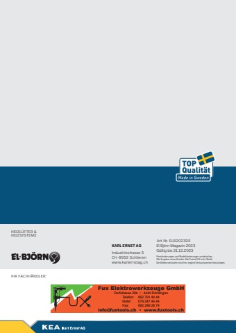 IHR FACHH%u00c4NDLER:HEIZL%u00dcFTER & HEIZSYSTEMEKARL ERNST AGIndustriestrasse 3 CH-8952 Schlierenwww.karlernstag.chEl Bj%u00f6rn Magazin 2023G%u00fcltig bis 31.12.2023Preis%u00e4nderungen und Modell%u00e4nderungen vorbehalten.Alle Angaben ohne Gew%u00e4hr. Alle Preise CHF exkl. MwSt.Die Wiederverk%u00e4ufer sind frei, eigene Verkaufspreise festzulegen.Art.Nr. ELB2023DEFux Elektrowerkzeuge GmbHinfo@fuxtools.ch %u2022 www.fuxtools.chDorfstrasse 20b %u2022 4444 R%u00fcmlingen062 791 44 44079 247 44 44062 299 26 74Telefon:Natel:Fax: