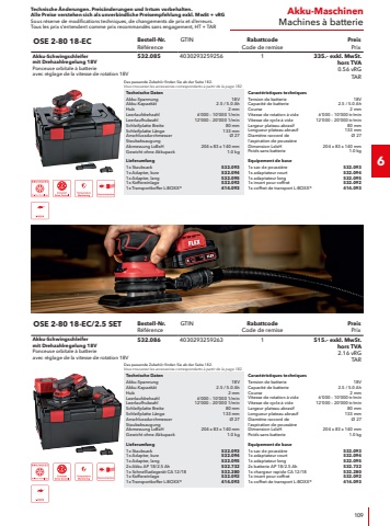 Technische %u00c4nderungen. Preis%u00e4nderungen und Irrtum vorbehalten.Alle Preise verstehen sich als unverbindliche Preisempfehlung exkl. MwSt + vRGSous r%u00e9serve de modifications techniques, de changements de prix et d%u2019erreurs. Tous les prix s%u2018entendent comme prix recommand%u00e9s sans engagement, HT + TAR132WinkelschleiferMeuleses d%u2018angleTechnische DatenLeistungsaufnahme1700 WLeistungsabgabe1050 WSpannung230 VFrequenz50/60 HzMax. Scheibendurchmesser125 mmLeerlaufdrehzahl11%u2018500 1/minWerkzeugaufnahmeM14Kabell%u00e4nge4.0 mAbmessung LxBxH340 x 77 x 105 mmGewicht2.6 kgLieferumfang1x Schutzhaube Schleifen436.8601x SoftVib-Handgriff530.9031x Spannflansch335.2821x Spannmutter M14100.080Caract%u00e9ristiques techniquesPuissance absorb%u00e9e1700 WPuissance utile1050 WTension230 VFr%u00e9quence50/60 HzDiam%u00e8tre de disque max.125 mmVitesse de rotation %u00e0 vide11%u2018500 tr/minEmmanchementM14Longueur de c%u00e2ble4.0 mDimension LxlxH340 x 77 x 105 mmPoids2.6 kgEquipement de base1x carter de protection du pon%u00e7age436.8601x poign%u00e9e SoftVib530.9031x bride de serrage335.2821x ecrou de serrage M14100.080LB 17-11 125Bestell-Nr.R%u00e9f%u00e9renceGTINRabattcodeCode de remisePreisPrix1700 Watt Winkelschleifer mitBremse, 125 mmMeuleuse d%u2018angle 1700 Watt avecfrein, 125 mm447.62540302931972681285.%u2013 exkl. MwSt. hors TVA 0.56 vRGTARTechnische DatenLeistungsaufnahme1700 WLeistungsabgabe1050 WSpannung230 VFrequenz50/60 HzMax. Scheibendurchmesser125 mmLeerlaufdrehzahl2%u2018800 %u201311%u2018500 1/minWerkzeugaufnahmeM14Kabell%u00e4nge4.0 mAbmessung LxBxH340 x 77 x 105 mmGewicht2.6 kgLieferumfang1x Schutzhaube Schleifen436.8601x SoftVib-Handgriff530.9031x Spannflansch335.2821x Spannmutter M14100.080Caract%u00e9ristiques techniquesPuissance absorb%u00e9e1700 WPuissance utile1050 WTension230 VFr%u00e9quence50/60 HzDiam%u00e8tre de disque max.125 mmVitesse de rotation %u00e0 vide2%u2018800 %u2013 11%u2018500 tr/minEmmanchementM14Longueur de c%u00e2ble4.0 mDimension LxlxH340 x 77 x 105 mmPoids2.6 kgEquipement de base1x carter de protection du pon%u00e7age436.8601x poign%u00e9e SoftVib530.9031x bride de serrage335.2821x ecrou de serrage M14100.080LBE 17-11 125Bestell-Nr.R%u00e9f%u00e9renceGTINRabattcodeCode de remisePreisPrix1700 Watt Winkelschleifer mit variablerDrehzahl und Bremse, 125 mmMeuleuse d%u2018angle 1700 Watt %u00e0 vitessede rotation variable et frein, 125 mm447.66840302931972821310.%u2013 exkl. MwSt. hors TVA 0.56 vRGTAR