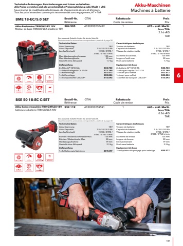 Technische %u00c4nderungen. Preis%u00e4nderungen und Irrtum vorbehalten.Alle Preise verstehen sich als unverbindliche Preisempfehlung exkl. MwSt + vRGSous r%u00e9serve de modifications techniques, de changements de prix et d%u2019erreurs. Tous les prix s%u2018entendent comme prix recommand%u00e9s sans engagement, HT + TAR152WinkelschleiferMeuleses d%u2018angleTechnische DatenLeistungsaufnahme2600 WLeistungsabgabe1800 WSpannung230 VFrequenz50/60 HzMax. Scheibendurchmesser230 mmLeerlaufdrehzahl6%u2018500 1/minSchnitttiefe60 mmWerkzeugaufnahmeM14Kabell%u00e4nge4.0 mAbmessung LxBxH610 x 195 x 290 mmGewicht9.18 kgLieferumfang1x Trenn-Absaughaube f%u00fcr grosseWinkelschleifer 230 mm471.8951x Diamantjet %u2013 DiamanttrennscheibeUniversal500.7203x Gummileiste494.5931x Distanzring494.6151x SoftVib-Handgriff325.3841x Spannmutter M14100.0801x Innensechskantschl%u00fcssel, SW 6104.1671x Stirnlochschl%u00fcssel, BL 5100.1101x Spannflansch335.2821x Transportkoffer499.579Caract%u00e9ristiques techniquesPuissance absorb%u00e9e2600 WPuissance utile1800 WTension230 VFr%u00e9quence50/60 HzDiam%u00e8tre de disque max.230 mmVitesse de rotation %u00e0 vide6%u2018500 tr/minProfondeur de coupe60 mmEmmanchementM14Longueur de c%u00e2ble4.0 mDimension LxlxH610 x 195 x 290 mmPoids9.18 kgEquipement de base1x carter de tron%u00e7onnage pour l%u2018aspirationde poussi%u00e8re avec meuleuse 230 mm471.8951x diamantjet %u2013 Disque de tron%u00e7onnagediamant%u00e9 universel500.7203x inserts en caoutchouc494.5931x rondelle d%u2018%u00e9cartement494.6151x poign%u00e9e SoftVib325.3841x ecrou de serrage M14100.0801x cl%u00e9 %u00e0 hex, SW 6104.1671x cl%u00e9 %u00e0 ergots, BL 5100.1101x bride de serrage335.2821x coffret de transport499.579DCG L 26-6 230 SetBestell-Nr.R%u00e9f%u00e9renceGTINRabattcodeCode de remisePreisPrixDiamant-Trennsystem, 230 mmSyst%u00e8me de d%u00e9coupe diamant, 230 mm494.63140302932241481640.%u2013 exkl. MwSt. hors TVA 2.31 vRGTARTechnische DatenLeistungsaufnahme2600 WLeistungsabgabe1800 WSpannung230 VFrequenz50/60 HzMax. Scheibendurchmesser230 mmLeerlaufdrehzahl6%u2018500 1/minSchnitttiefe60 mmWerkzeugaufnahmeM14Kabell%u00e4nge4.0 mAbmessung LxBxH610 x 195 x 290 mmGewicht9.18 kgLieferumfang1x Trenn-Absaughaube f%u00fcr grosseWinkelschleifer 230 mm471.8951x Diamantjet %u2013 DiamanttrennscheibeUniversal500.7201x F%u00fchrungsschiene GRS 80353.2803x Gummileiste494.5931x Distanzring494.6151x SoftVib-Handgriff325.3841x Spannmutter M14100.0801x Innensechskantschl%u00fcssel, SW 6104.1671x Stirnlochschl%u00fcssel, BL 5100.1101x Spannflansch335.2821x Transportkoffer499.579Caract%u00e9ristiques techniquesPuissance absorb%u00e9e2600 WPuissance utile1800 WTension230 VFr%u00e9quence50/60 HzDiam%u00e8tre de disque max.230 mmVitesse de rotation %u00e0 vide6%u2018500 tr/minProfondeur de coupe60 mmEmmanchementM14Longueur de c%u00e2ble4.0 mDimension LxlxH610 x 195 x 290 mmPoids9.18 kgEquipement de base1x carter de tron%u00e7onnage pour l%u2018aspirationde poussi%u00e8re avec meuleuse 230 mm471.8951x diamantjet %u2013 Disque de tron%u00e7onnagediamant%u00e9 universel500.7201x rail de guidage GRS 80353.2803x inserts en caoutchouc494.5931x rondelle d%u2018%u00e9cartement494.6151x poign%u00e9e SoftVib325.3841x ecrou de serrage M14100.0801x cl%u00e9 %u00e0 hex, SW 6104.1671x cl%u00e9 %u00e0 ergots, BL 5100.1101x bride de serrage335.2821x coffret de transport499.579DCG L 26-6 230 G-SetBestell-Nr.R%u00e9f%u00e9renceGTINRabattcodeCode de remisePreisPrixDiamant-Trennsystem, 230 mmSyst%u00e8me de d%u00e9coupe diamant, 230 mm494.67440302932241551720.%u2013 exkl. MwSt. hors TVA 2.31 vRGTAR