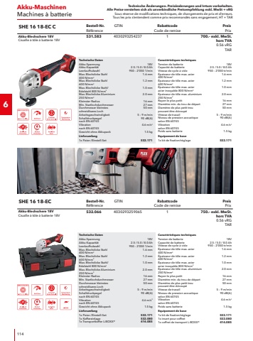 Technische %u00c4nderungen. Preis%u00e4nderungen und Irrtum vorbehalten.Alle Preise verstehen sich als unverbindliche Preisempfehlung exkl. MwSt + vRGSous r%u00e9serve de modifications techniques, de changements de prix et d%u2019erreurs. Tous les prix s%u2018entendent comme prix recommand%u00e9s sans engagement, HT + TAR18Zubeh%u00f6r WinkelschleiferAccessoires Meulese d%u2018angle2Trenn-Absaughaube f%u00fcr grosse Winkelschleifer 230 mmCarter de tron%u00e7onnage pour l%u2018aspiration de poussi%u00e8re avec meuleuse 230 mmRabattcodeCode de remise2Trenn-Absaughaube mit effizienter Staubabsaugung f%u00fcr exakte Schnitte bei Arbeiten mit Diamant-Trennscheiben in Verbindung mit 230 mm Winkelschleifern. Extrem stabil, keine Verwindung durch das seitliche Gewicht des Winkelschleifers, dank Stabilisator-Element. Bodenplatte mit Rollen f%u00fcr einen einfachen Vorschub, Seitenhandgriff wahlweise links oder rechts montierbar. Inkl. Sauganschluss f%u00fcr FLEX Clip-System und Adapter f%u00fcr F%u00fchrungsschiene. Tiefenanschlag mit Skala zur Voreinstellung der Schnitttiefe f%u00fcr die Verwendung mit oder ohne F%u00fchrungsschiene. Maximale Schnitt-Tiefe 60 mm.Capot d%u2018aspiration de tron%u00e7onnage avec aspiration efficace des poussi%u00e8res pour des coupes pr%u00e9cises lors de travaux avec des disques %u00e0 tron%u00e7onner diamant%u00e9s en combinaison avec des meuleuses d%u2018angle de 230 mm. Extr%u00eamement stable, pas de torsion due au poids lat%u00e9ral de la meuleuse d%u2018angle, gr%u00e2ce %u00e0 l%u2018%u00e9l%u00e9ment stabilisateur. Plaque de fond avec roulettes pour une avance facile, poign%u00e9e lat%u00e9rale pouvant %u00eatre mont%u00e9e au choix %u00e0 gauche ou %u00e0 droite. Raccord d%u2018aspiration pour syst%u00e8me de clipsage FLEX et adaptateur pour rail de guidage inclus. But%u00e9e de profondeur avec %u00e9chelle gradu%u00e9e pour le pr%u00e9r%u00e9glage de la profondeur de coupe pour l%u2018utilisation avec ou sans rail de guidage. Profondeur de coupe maximale de 60 mm.BezeichnungD%u00e9signationDurchmesserDiam%u00e8treBestell-Nr.R%u00e9f%u00e9renceVEUEPreis PrixDCG AG 230230 mm471.8951239.%u2013Schutzhauben-Deckel-Trennen, universalCouvercle pour capot de protection, universelRabattcodeCode de remise2Zur werkzeuglosen Umr%u00fcstung der vorhandenen Schutzhaube f%u00fcr Trennarbeiten.Pour transformer sans outil le capot de protection existant pour les travaux de tron%u00e7onnageBezeichnungD%u00e9signationDurchmesserDiam%u00e8treBestell-Nr.R%u00e9f%u00e9renceVEUEPreis PrixGU-AD D125125 mm446.041144.%u2013GU-AD D180180 mm446.718166.%u2013GU-AD D230230 mm446.068178.%u2013Absaughaube mit abnehmbarem RandsegmentCapot d%u2018aspiration avec segment amovibleRabattcodeCode de remise2Erm%u00f6glicht randnahes Arbeiten bei h%u00f6chster Absaugleistung. H%u00f6henverstellung %u00fcber Innensechskantschraube erlaubt ein schnelles Anpassen der Absaughaube auf die Werkzeugh%u00f6he. Hinweis: f%u00fcr das Arbeiten mit der Absaughaube und Diamantschleiftellern wird ein Winkelschleifer mit mindestens 1500 Watt empfohlen. Nur passend f%u00fcr Winkelschleifer mit Rastmechanik-Schutzhaube.Permet de travailler au plus pr%u00e8s des bords avec une puissance d%u2018aspiration maximale. Le r%u00e9glage en hauteur par vis %u00e0 six pans creux permet d%u2018adapter rapidement la hotte d%u2018aspiration %u00e0 la hauteur de l%u2018outil. Remarque : pour travailler avec la hotte d%u2018aspiration et les plateaux de pon%u00e7age diamant%u00e9s, il est recommand%u00e9 d%u2018utiliser une meuleuse d%u2018angle d%u2018au moins 1500 watts. Convient uniquement aux meuleuses d%u2018angle avec capot de protection %u00e0 m%u00e9canisme d%u2018encliquetage.BezeichnungD%u00e9signationDurchmesserDiam%u00e8treBestell-Nr.R%u00e9f%u00e9renceVEUEPreis PrixSG-R D125125 mm452.5721110.%u2013B%u00fcrstenkranzBrosseRabattcodeCode de remise2B%u00fcrstenkranz f%u00fcr Absaughaube, enth%u00e4lt zwei Segmentteile.Couronne de brosses pour hotte d%u2018aspiration, contient deux parties de segment.BezeichnungD%u00e9signationBestell-Nr.R%u00e9f%u00e9renceVEUEPreis PrixBK-H SG-R D125454.656148.%u2013